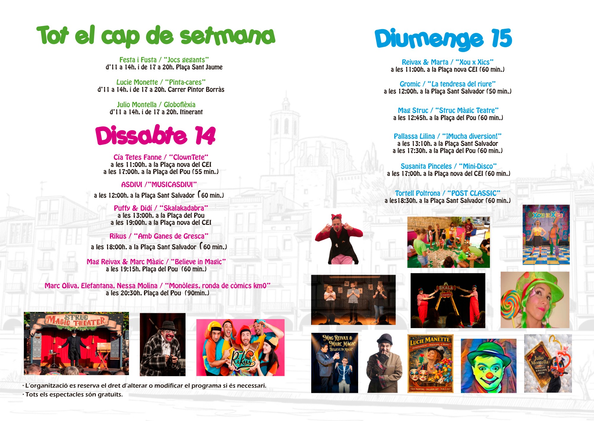 El festival començarà dissabte 14 amb l’espectacle ClownTete, a càrrec de la companyia Tetes Fanne, i amb la proposta musical Musicasdivi. A la tarda, els més petits podran gaudir de les actuacions de Puffy & Didi i de Rikus. Tot seguit, el mag Reivax i Marc Màgic presentaran l’espectacle Believe in Magic. La jornada es clourà amb una ronda de monòlegs amb còmics de la zona.