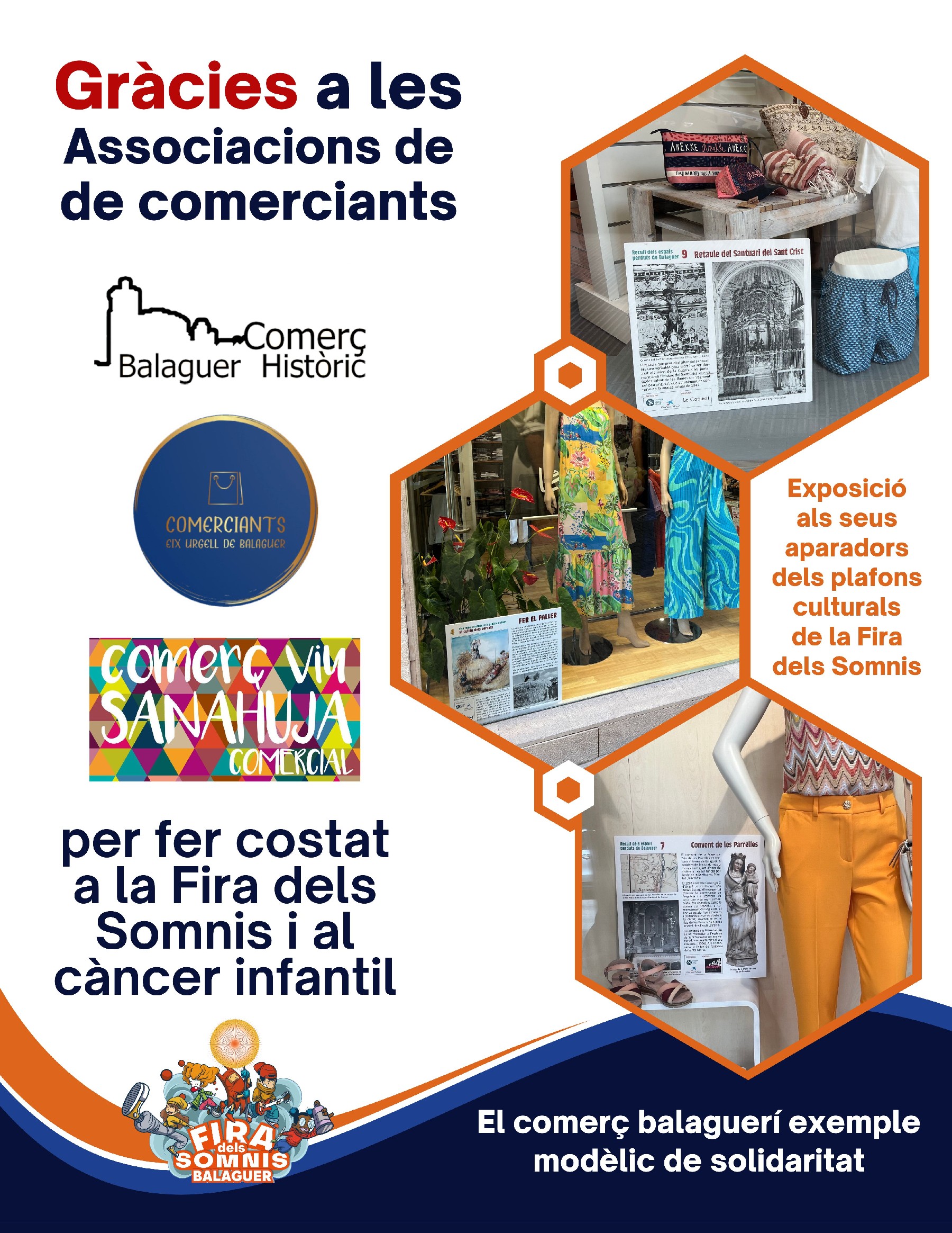 Per tal de continuar amb les seves accions solidàries envers el càncer infantil i juvenil, més d'una cinquantena de comerços de Balaguer, coordinats per part de les associacions Comerç del Balaguer Històric, Comerç Viu Sanahuja Comercial i els Comerciants de l'Eix Urgell, exposaran als seus aparadors els plafons culturals i educatius editats per l'Associació Balaguer contra el Càncer Infantil en el marc de la IX Fira dels Somnis, que va tenir la seva culminació el passat diumenge 4 de maig.