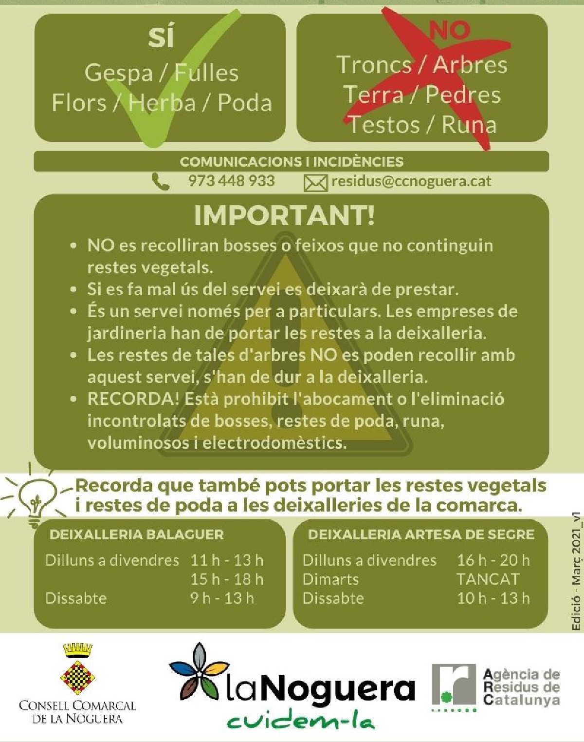 A partir del 7 d'abril i fins al 27 d'octubre, el Consell Comarcal de la Noguera oferirà de nou el servei de recollida selectiva de residus. Es tracta d'un servei que recull les restes vegetals i de poda generades per persones particulars que es va posar en marxa l'any passat com a prova pilot, atès que des de l'Àrea de Residus del Consell Comarcal s'havia detectat un augment d'aquest tipus de restes.