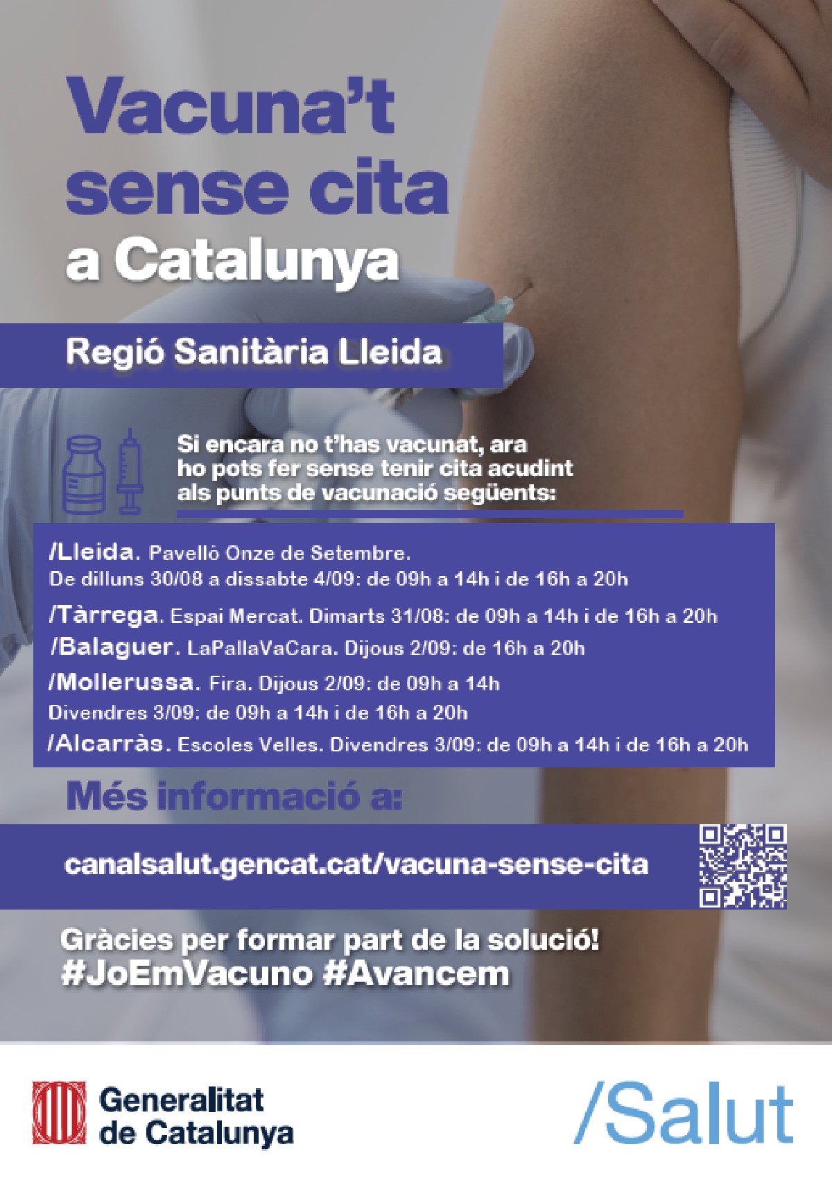 El departament de Salut programa noves vacunacions sense cita a Balaguer: Concretament aquest dijous dia 1 de setembre de 4 a 7 de la tarda al Cap de Balaguer i de 4 a 8 al Casal Lapallavacara. La vacuna que s'administrarà serà Pfizer.