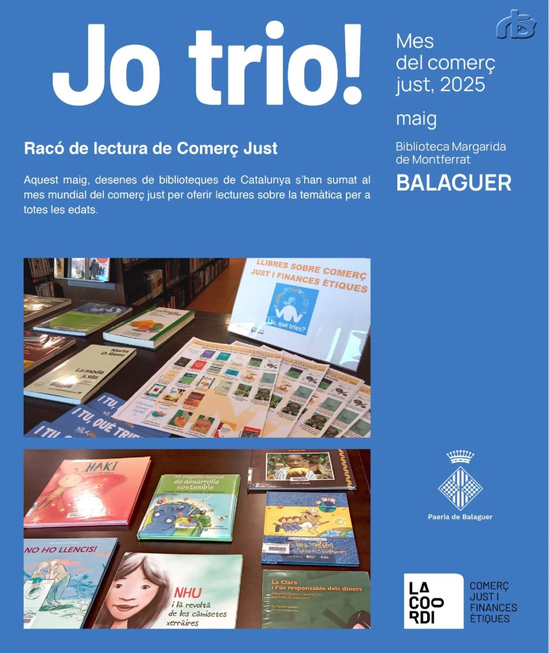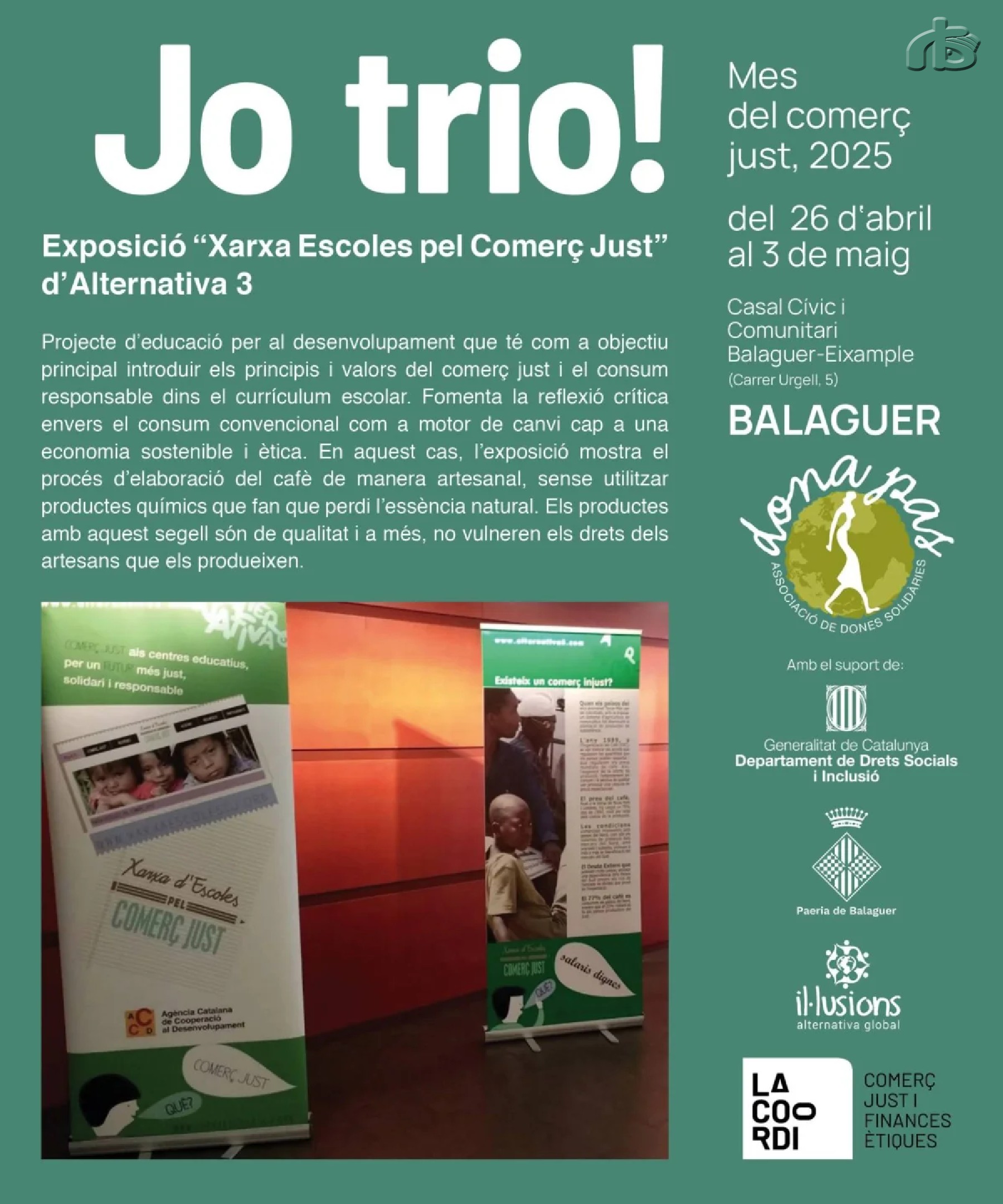 El Mes del Comerç Just compta amb la col·laboració de l'Associació Dona Pas, el Pla Educatiu d'Entorn de Balaguer i l'Associació Reintegra, i LaCoordi (Coordinadora de Comerç Just i Finances Ètiques).