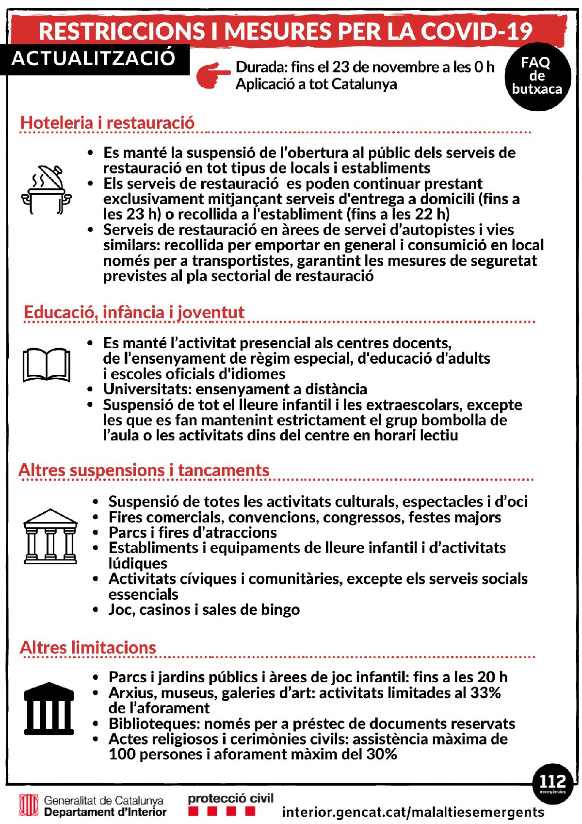 El DOGC publica la pròrroga del tancament de la restauració, cinemes, teatres i gimnasos fins al dia 23. Els centres d'estètica poden obrir amb cita prèvia. Els transportistes poden consumir dins dels restaurants de les àrees de servei