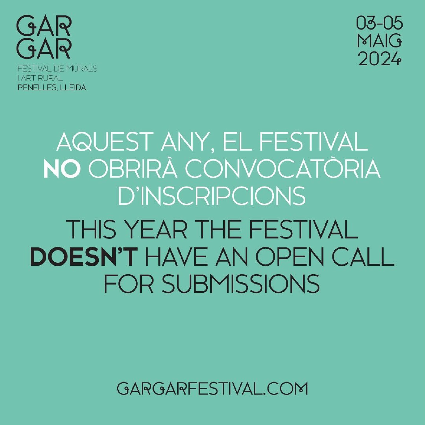 El festival Gargar d'art mural i rural ha anunciat que aquest any no obrirà convocatòria per a la selecció dels projectes que durant els dies del festival els diferents artistes plasmaran als murs del municipi.