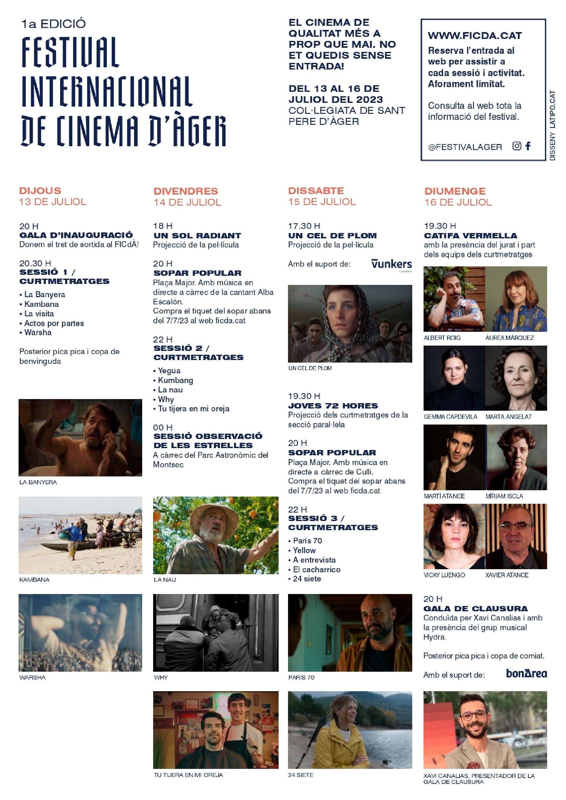 Demà, dijous 13 de juliol, arrenca la primera edició del FICdÀ-Festival de Cinema Internacional d'Àger. Ho farà amb les entrades exhaurides en la seva gala inaugural i la primera sessió de projeccions de curtmetratges de la secció oficial del festival. Fins el diumenge 16 de juliol, la Col·legiata de Sant Pere d'Àger, un dels conjunts més importants del romànic català, serà l'escenari del FICdÀ, un certamen impulsat per la productora Silendum Films i l'Ajuntament d'Àger que té com a objectiu apropar el cinema de qualitat a les Terres de Lleida enmig d'un entorn únic del Prepirineu, als peus de la Serra del Montsec, declarada Geoparc Mundial per la Unesco, i certificada com a Reserva Starlight per la qualitat del seu cel nocturn.