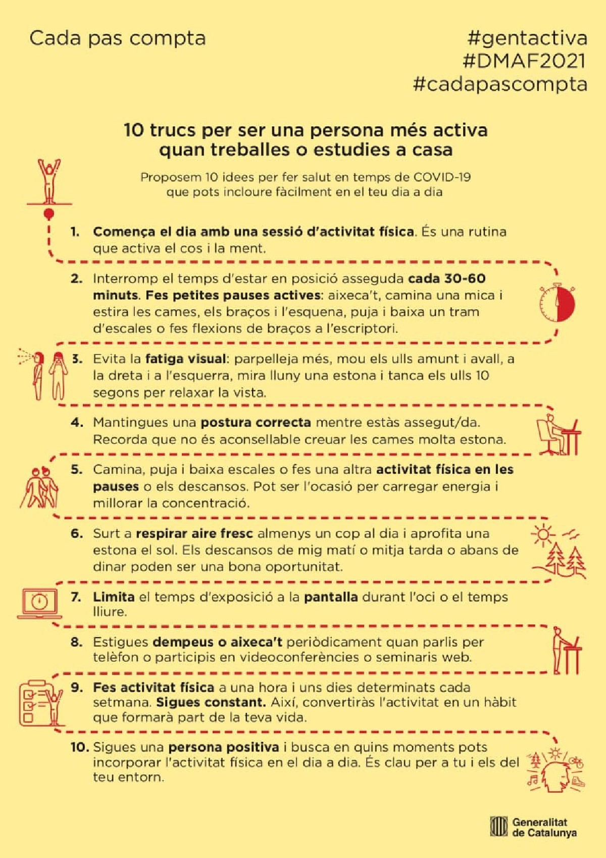 El Govern de la Generalitat engega la campanya del Dia Mundial de l'Activitat Física (DMAF), una celebració que té lloc a tot el món cada 6 d'abril i a la qual Catalunya s'adhereix per dotzè any consecutiu amb el lema "Cada pas compta". En un moment en què els hàbits de feina i oci de la societat han canviat a causa de la Covid-19, el Govern vol animar la ciutadania a acumular minuts i quilòmetres d'activitat per combatre el sedentarisme i promoure un estil de vida actiu a persones de totes les edats.