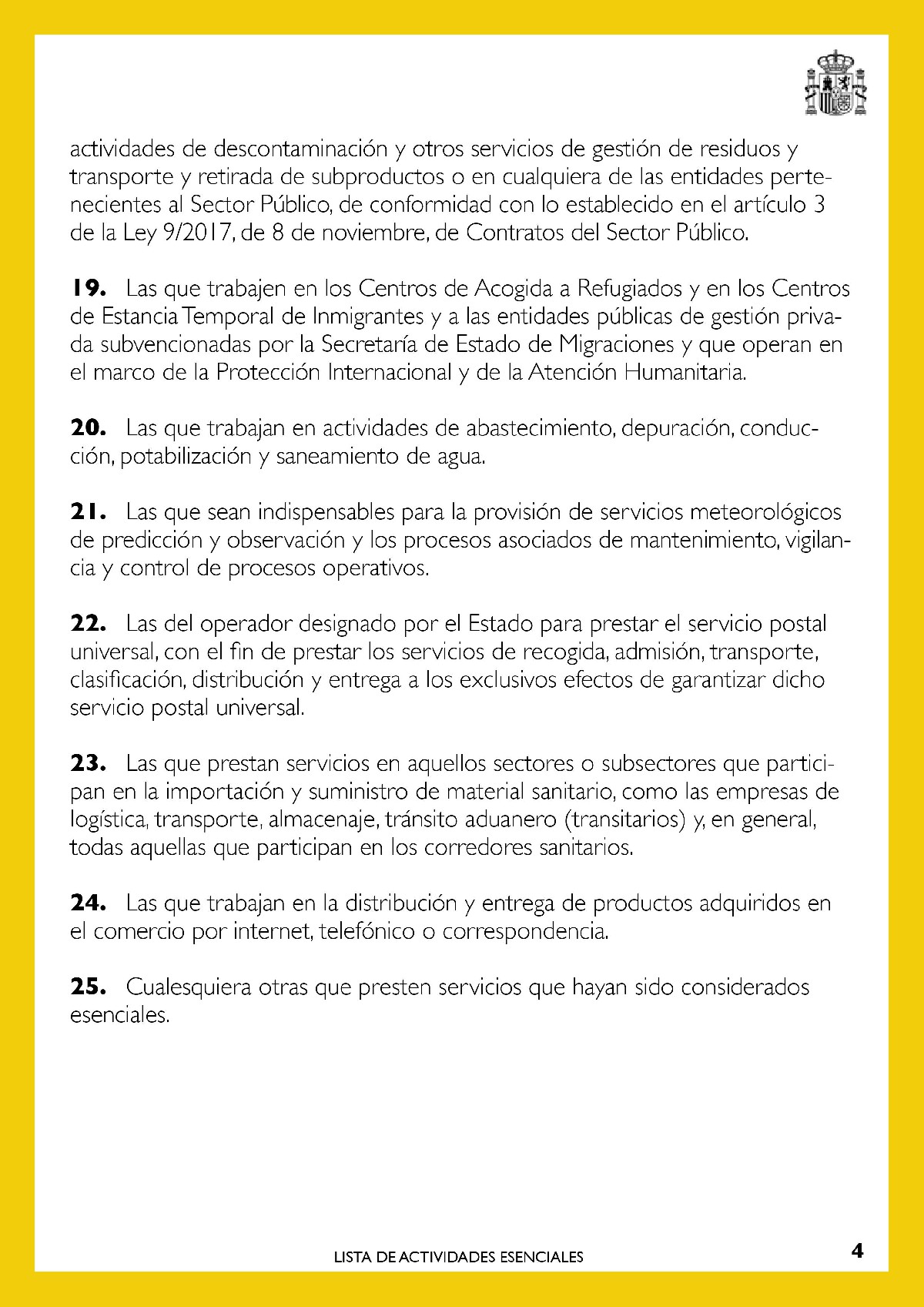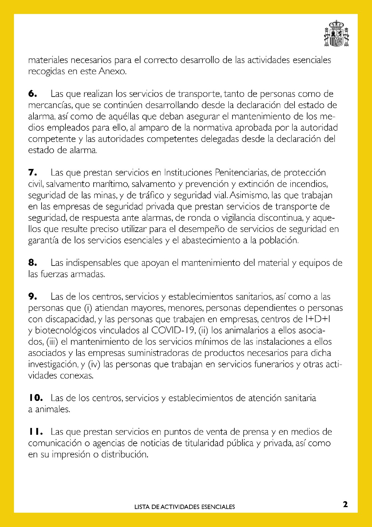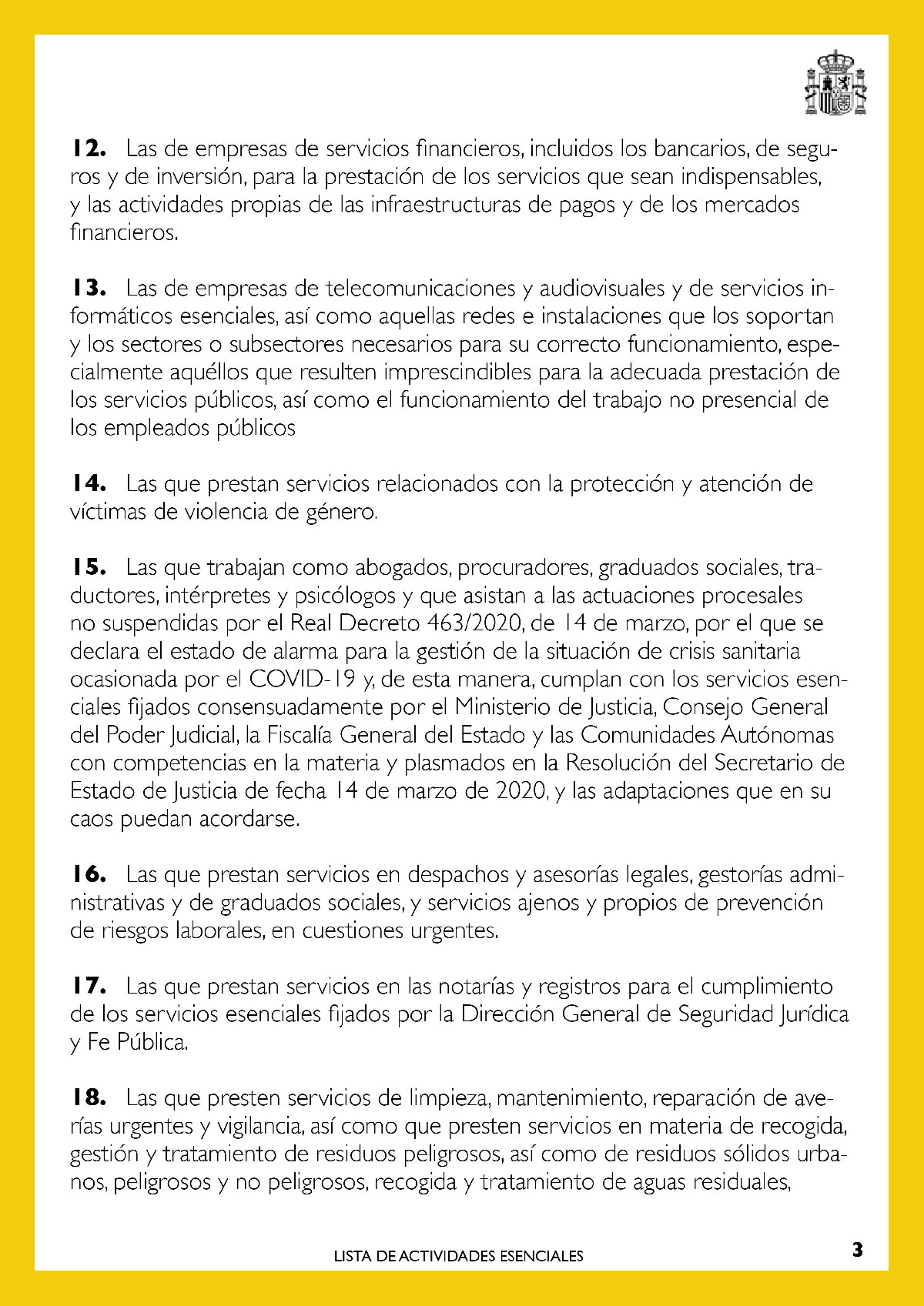 El govern espanyol ha establert una moratòria d'un dia per al confinament total per als casos que resulti "impossible" interrompre "immediatament" l'activitat i es pugui fer paulatinament. Segons el BOE, publicat a les 23.35 hores del diumenge a la nit, les persones de serveis no essencials podran fer tasques "imprescindibles" durant el dilluns 30 de març per evitar que l'aturada "no perjudiqui de manera irremeiable o desproporcionada la represa de l'activitat empresarial". El decret també estableix que les empreses, en cas de ser necessari, podran establir el número mínim de plantilla o torns "estrictament imprescindibles per mantenir l'activitat indispensable", com en un cap de setmana o en festius.