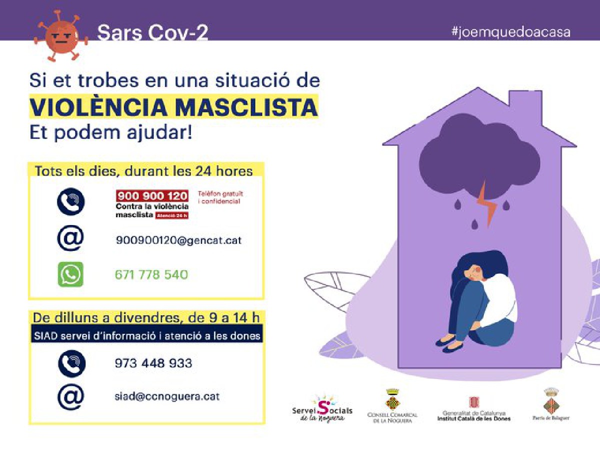 Des de l'Institut Català de les Dones de la Generalitat de Catalunya, a través del Servei d'Informació i Atenció a les Dones (SIAD), s'ha reforçat el servei permanent d'atenció a dones en situació de violència masclista amb l'objectiu que no hi hagi cap dona desatesa malgrat el confinament.