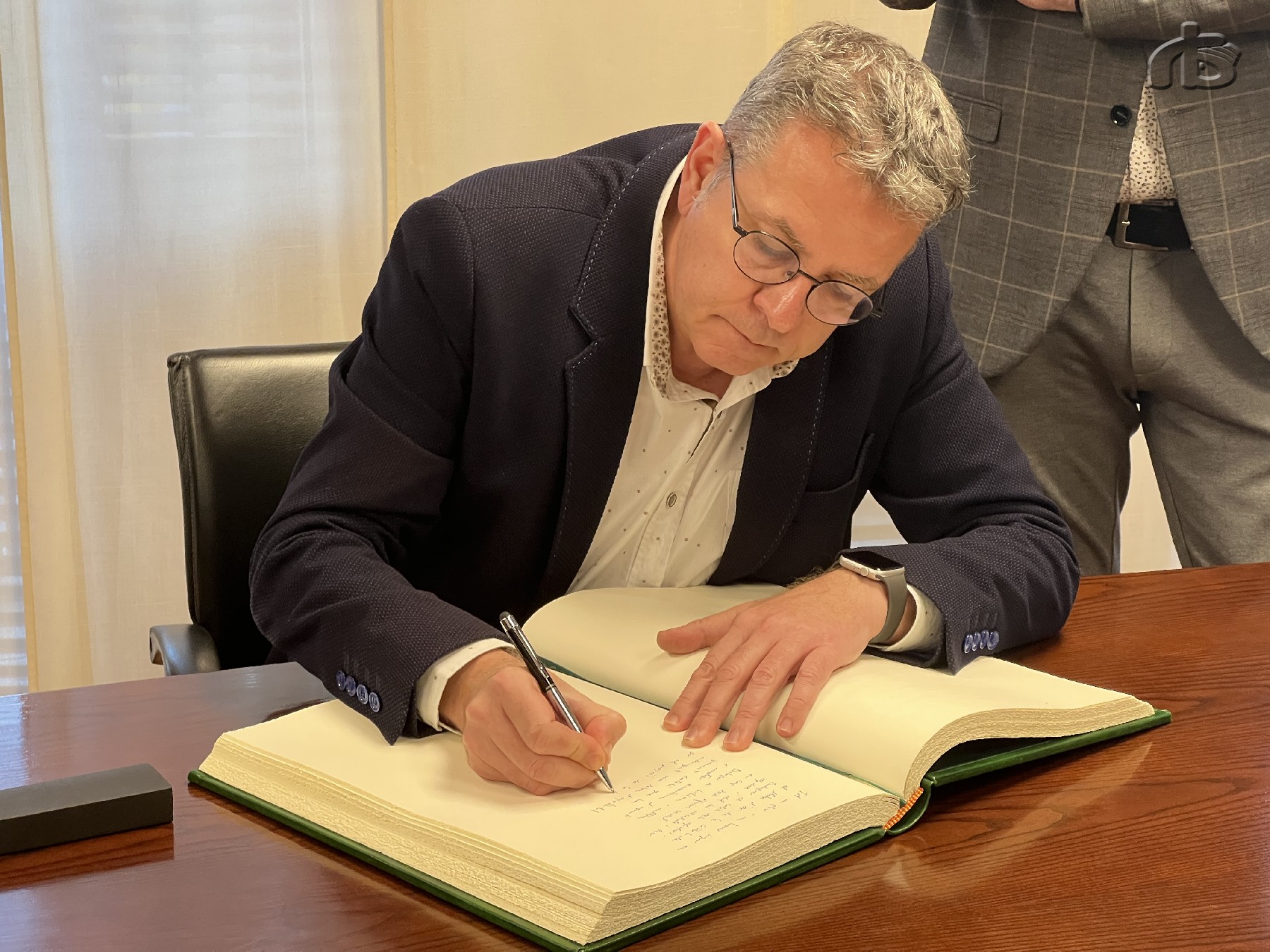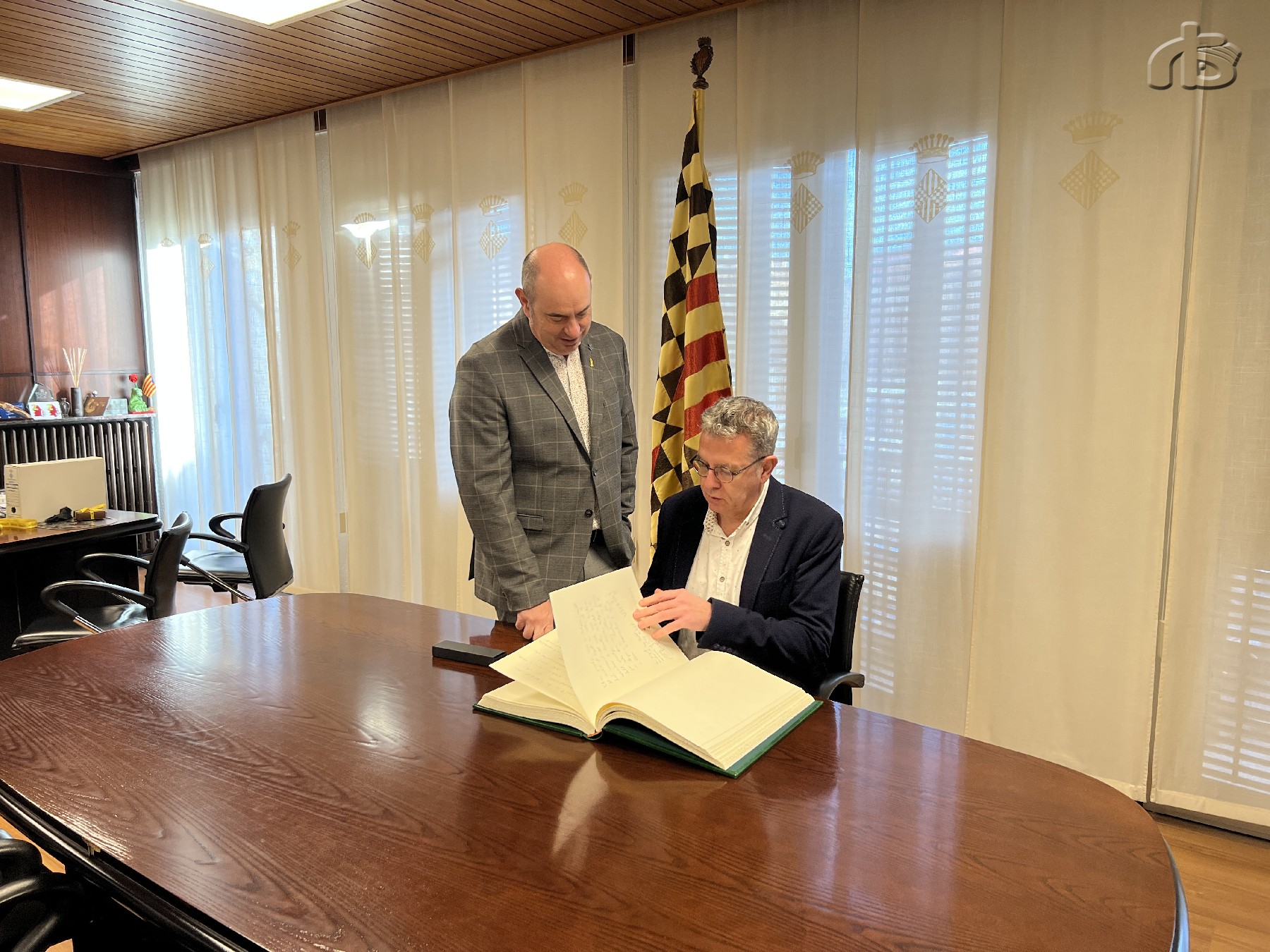 Abans de la visita d'obres, el president provincial ha estat rebut a la casa de la Paeria pel paer en cap i la resta d'autoritats locals. Allà ha signat al Llibre d'Honor de la ciutat.