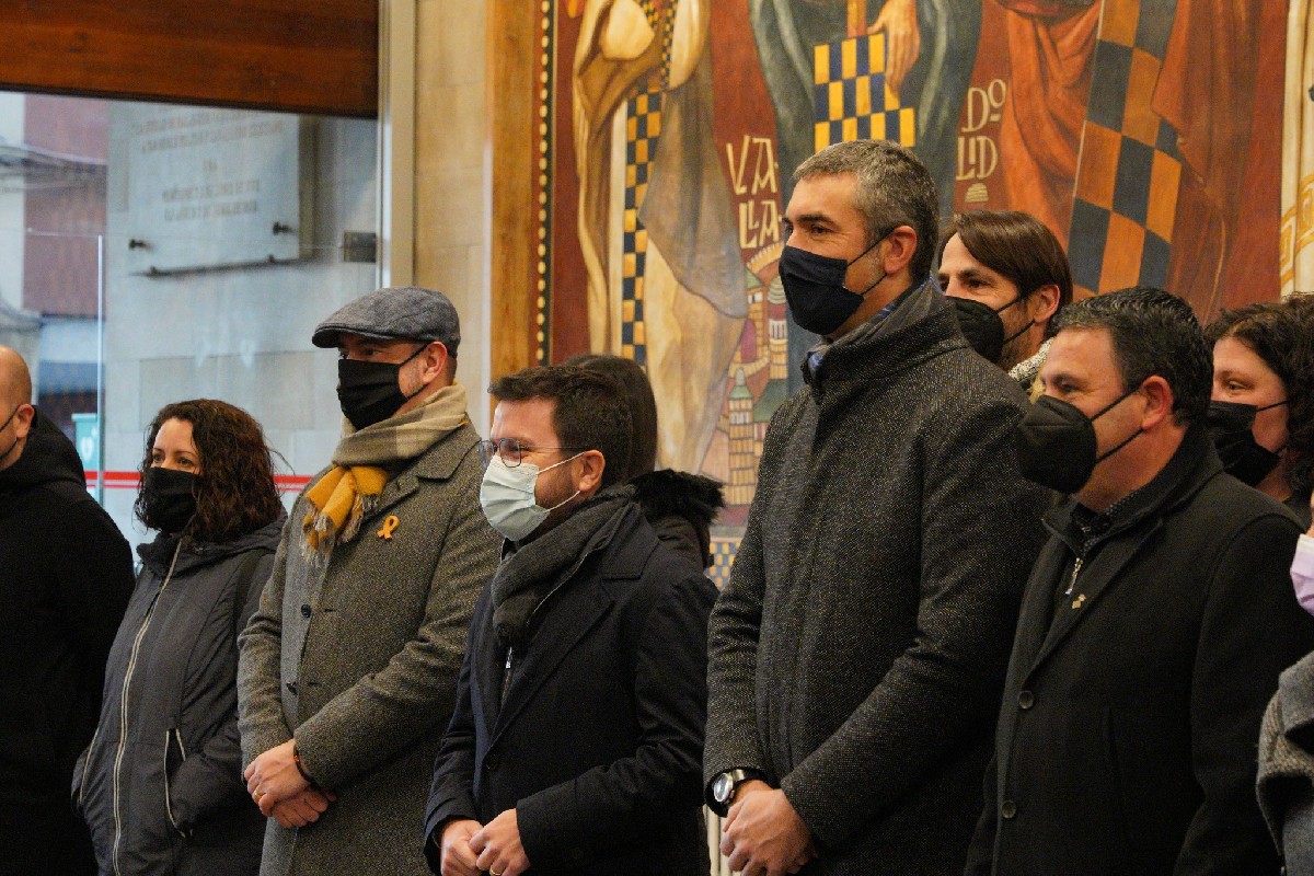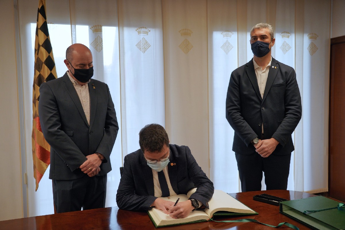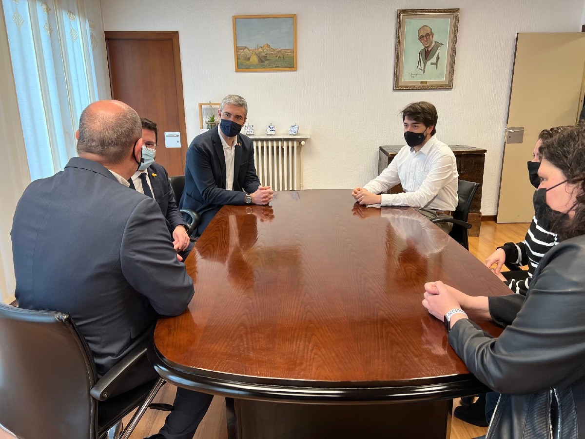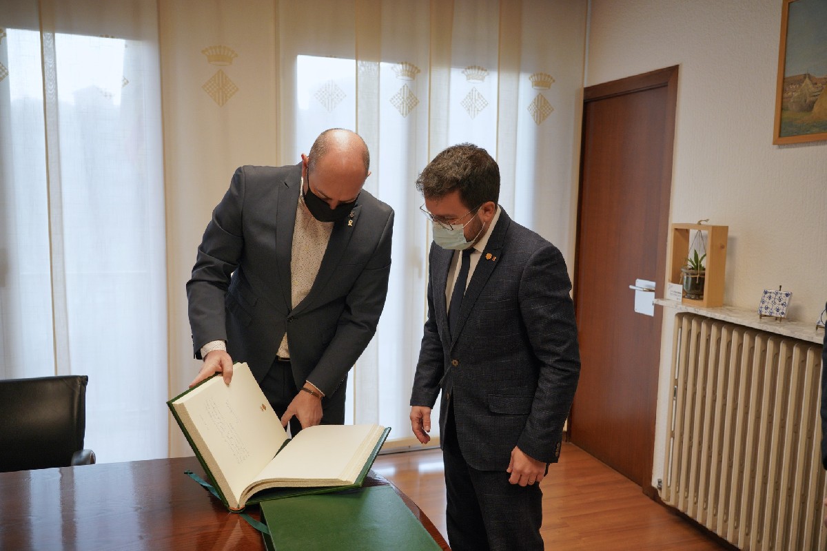 El president de la Generalitat, Pere Aragonès, s'ha reunit a primera hora d'aquest matí amb el paer en cap de Balaguer, Jordi Ignasi Vidal. Ho ha fet a la Paeria, on ha signat al Llibre d'honor de la ciutat en presència d'altres autoritats, entre elles, el delegat del Govern a Lleida, Bernat Solé, i seguint totes les mesures de seguretat establertes a causa de la pandèmia.
