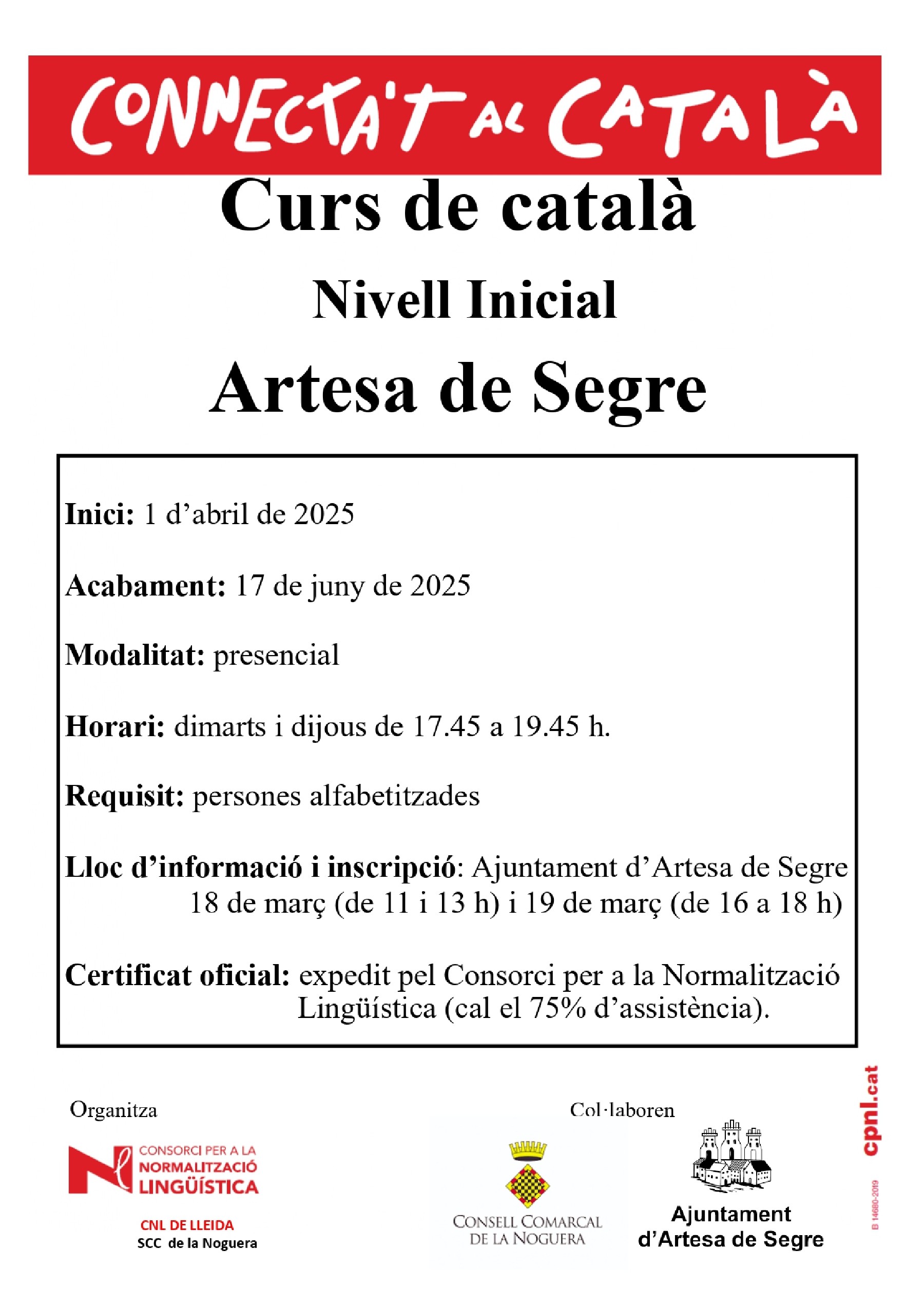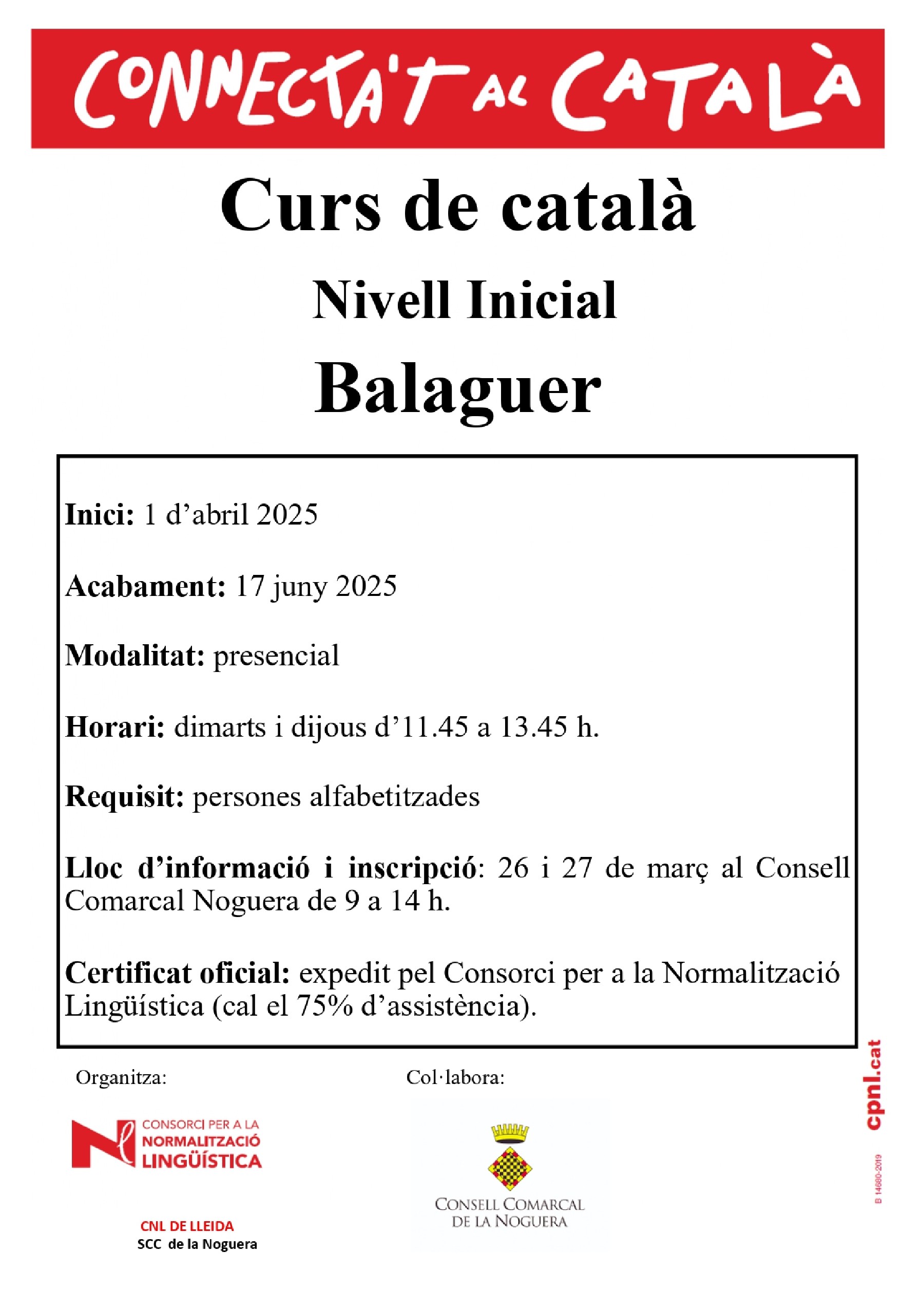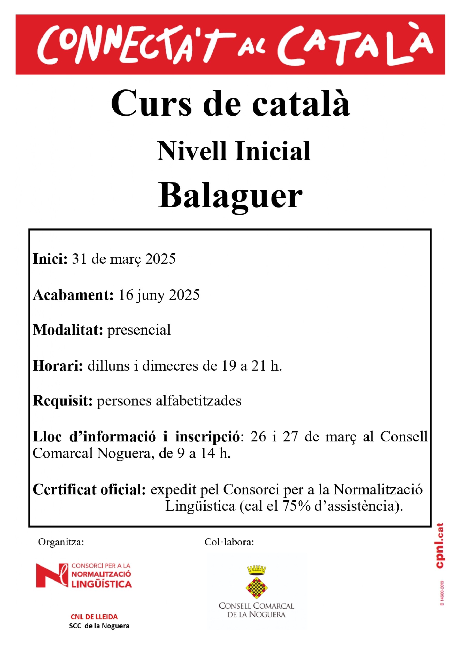 Informació per als cursos presencials: Oficina del Servei Comarcal de Català ubicada al Consell Comarcal, al telèfon 973 448 933 o al correu electrònic noguera@cpnl.cat