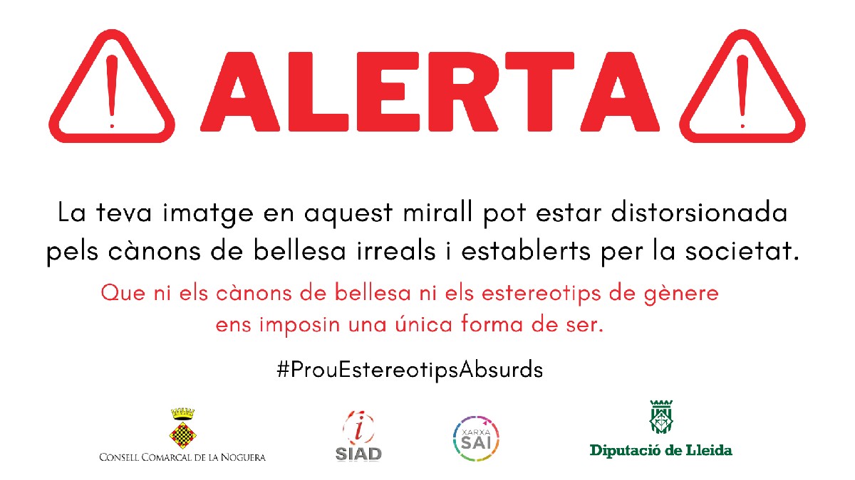 Aquest mes d'abril el Servei d'Informació i Atenció a les Dones del Consell Comarcal de la Noguera llança la campanya "Prou estereotips absurds", que s'adreça als infants i adolescents de la comarca amb la finalitat de promoure una actitud crítica respecte els cànons de bellesa establerts en la publicitat, els mitjans de comunicació i les xarxes socials, i fomentar el respecte i la cura del propi cos.