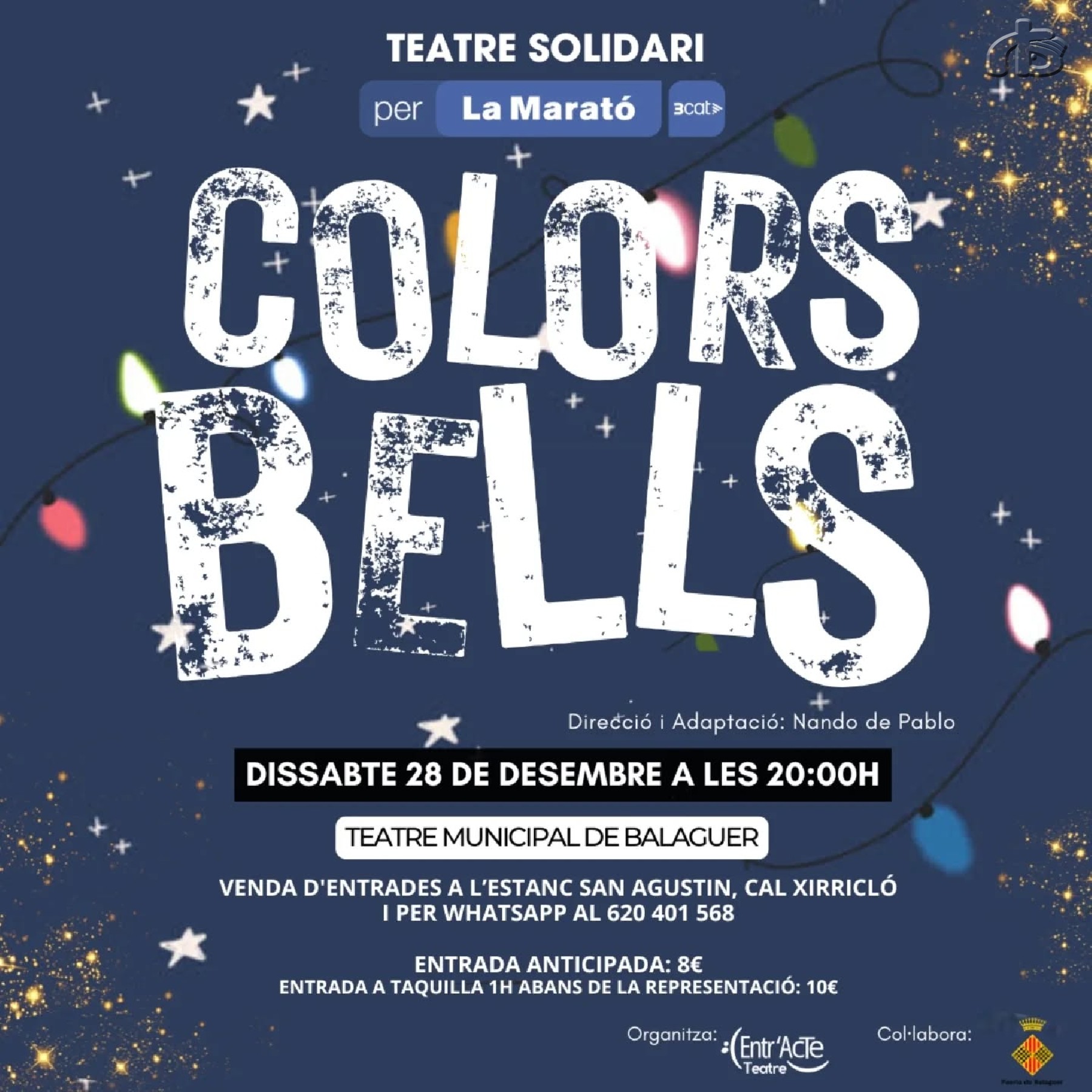 El pròxim dissabte 28 de desembre a les 20h, el Teatre Municipal de Balaguer serà l'escenari de Colors Bells, un musical nadalenc a càrrec d'Entr'acte Teatre dirigit a petits i grans que reivindica l'alegria i els valors del Nadal.
