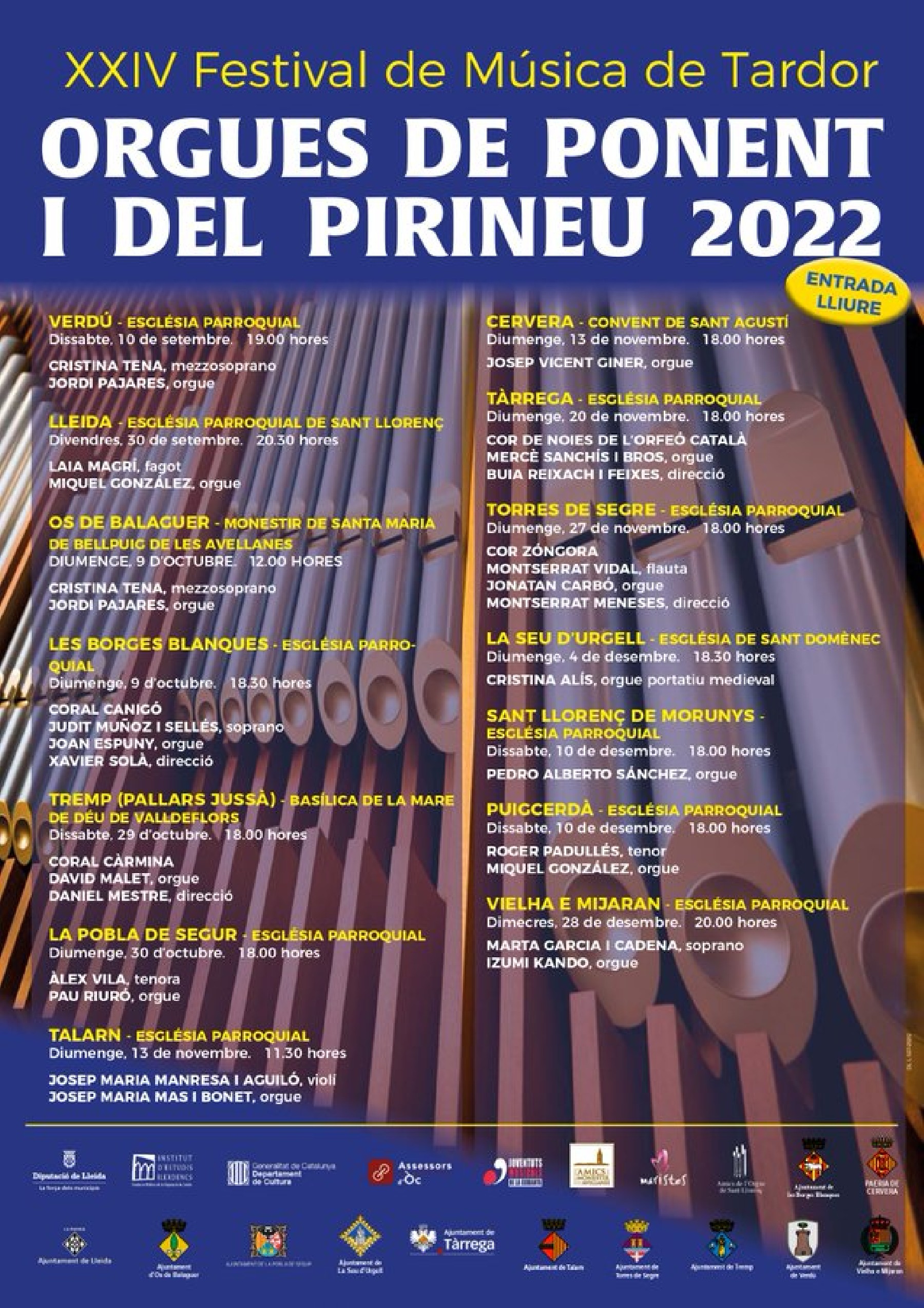 La primera cita del Festival va ser a Verdú el dissabte 10 de setembre amb la mezzosoprano Cristina Tena, guanyadora del Premi de Cant "Ciutat de Balaguer", acompanyada a l'orgue per Jordi Pajares, concert que es repetirà al monestir de Santa Maria de Bellpuig de les Avellanes el diumenge 9 d'octubre.