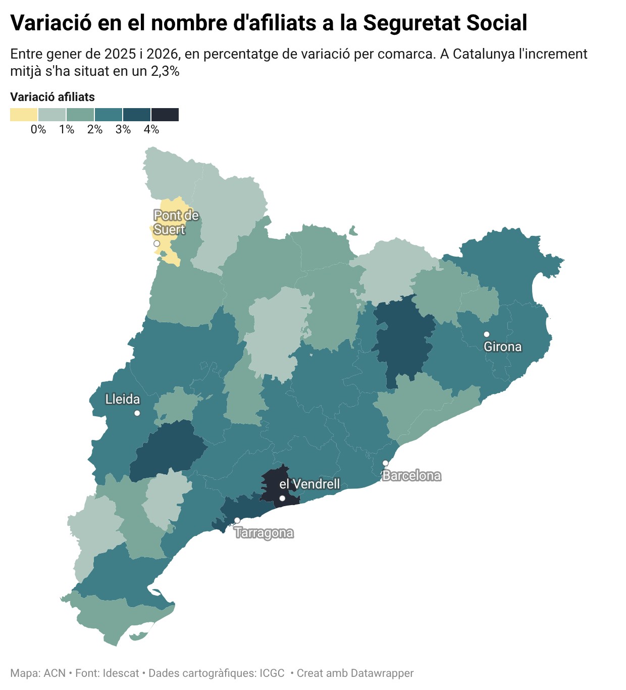 En relació amb el mes de desembre del 2025, el nombre d’afiliats disminueix en 7.775 persones (‑0,2%) al conjunt de Catalunya i també a 27 comarques i l’Aran.