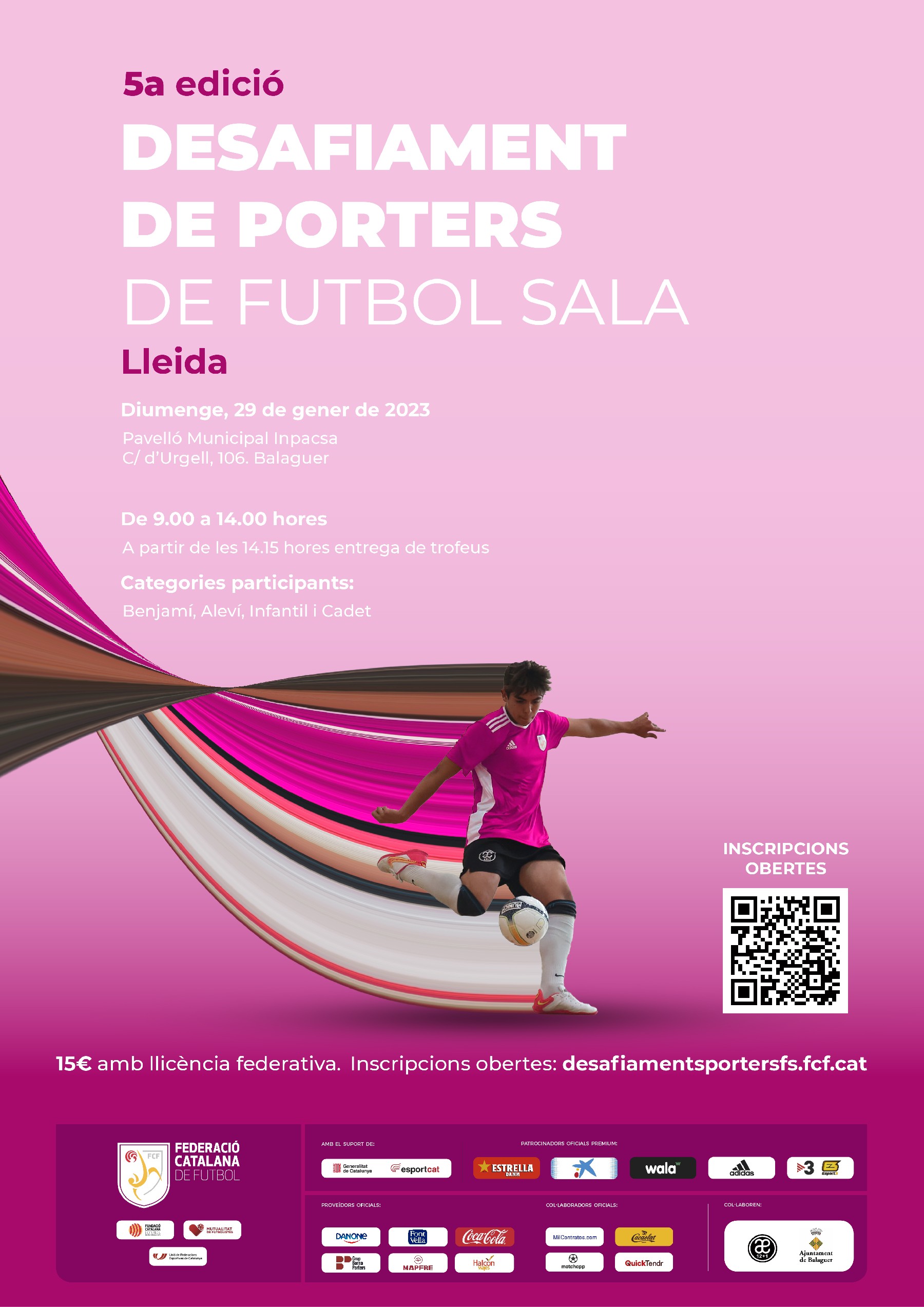 El Comitè Tècnic d'Entrenadors de Futbol Sala de la Lliga Catalana de Futbol Sala de l'FCF durà a terme el diumenge, 29 de gener de 2023, la 5a edició del Desafiament de Porters de Lleida al Pavelló Municipal Inpacsa de Balaguer amb la presència total de 73 porters i porteres que s'enfrontaran per categories en una pista de 10x10 amb l'objectiu d'encaixar poc i marcar molts gols.