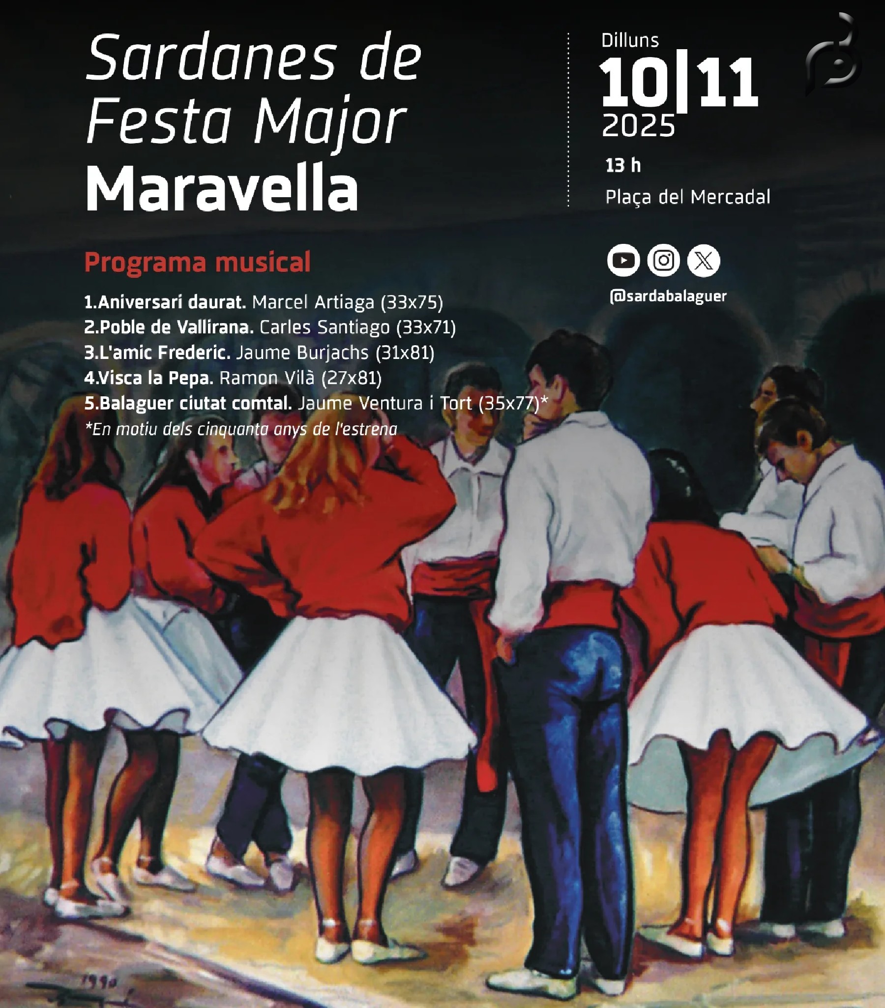 La programació #sardanista s'acabarà dilluns amb una mitja ballada a càrrec de la cobla-orquestra Maravella, que oferirà un programa centrat en sardanes balladores. L'audició tindrà lloc a la plaça del Mercadal a partir de la una, i es clourà amb Balaguer ciutat comtal, sumant-nos d'aquesta manera als actes de commemoració del cinquantenari de l'estrena d'aquesta obra de Jaume Ventura i Tort.