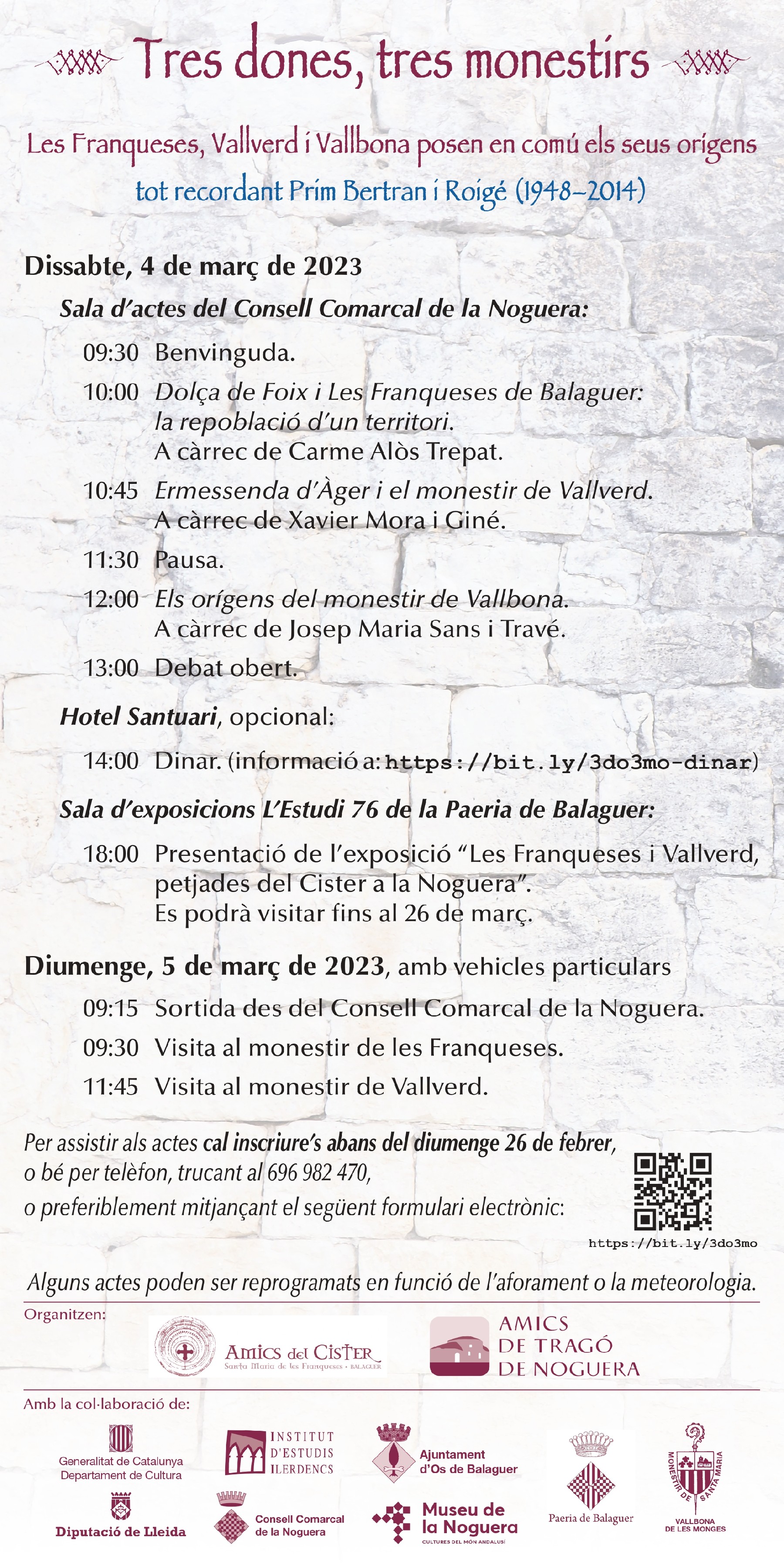 Per assistir als actes programats cal inscriure ́s prèviament abans del 26 de febrer preferiblement a través de l'enllaç electrònic https://bit.ly/3do3mo o bé trucant al telèfon 696 982470.