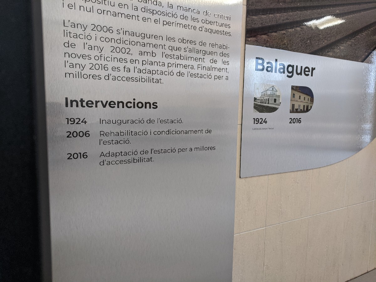 Ferrocarrils de la Generalitat posa en valor el patrimoni arquitectònic de les seves estacions de tren, entre elles la de Balaguer. La companyia ha instal·lat plafons informatius amb imatges i dades sobre la seva història i l'evolució arquitectònica