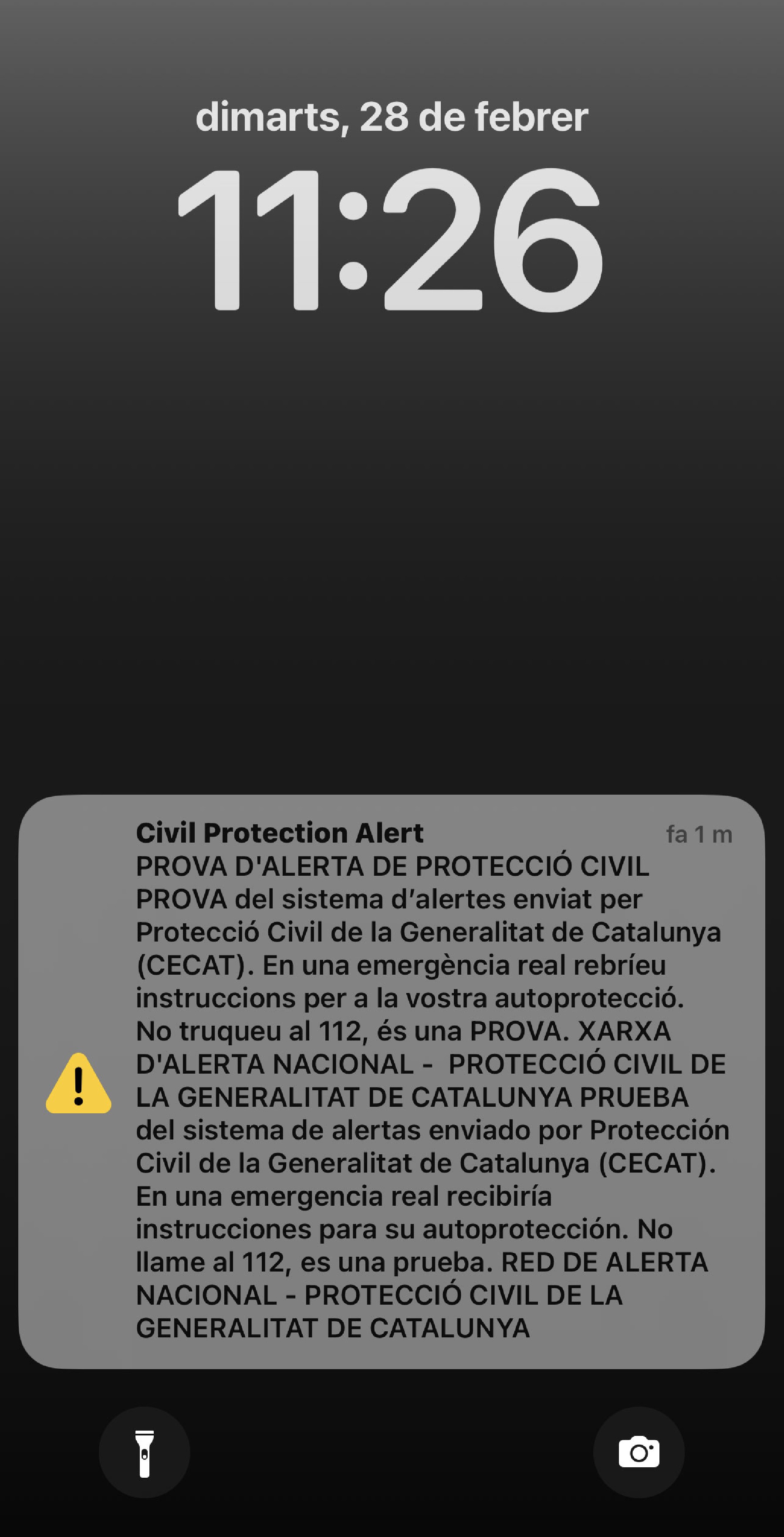 Una alarma ha sonat als mòbils de la demarcació de Lleida aquest migdia en la primera prova feta per Protecció Civil a Catalunya per alertar de possibles emergències. L'alerta però, ha arribat més tard del previst i no ha sonat en tots els dispositius.
