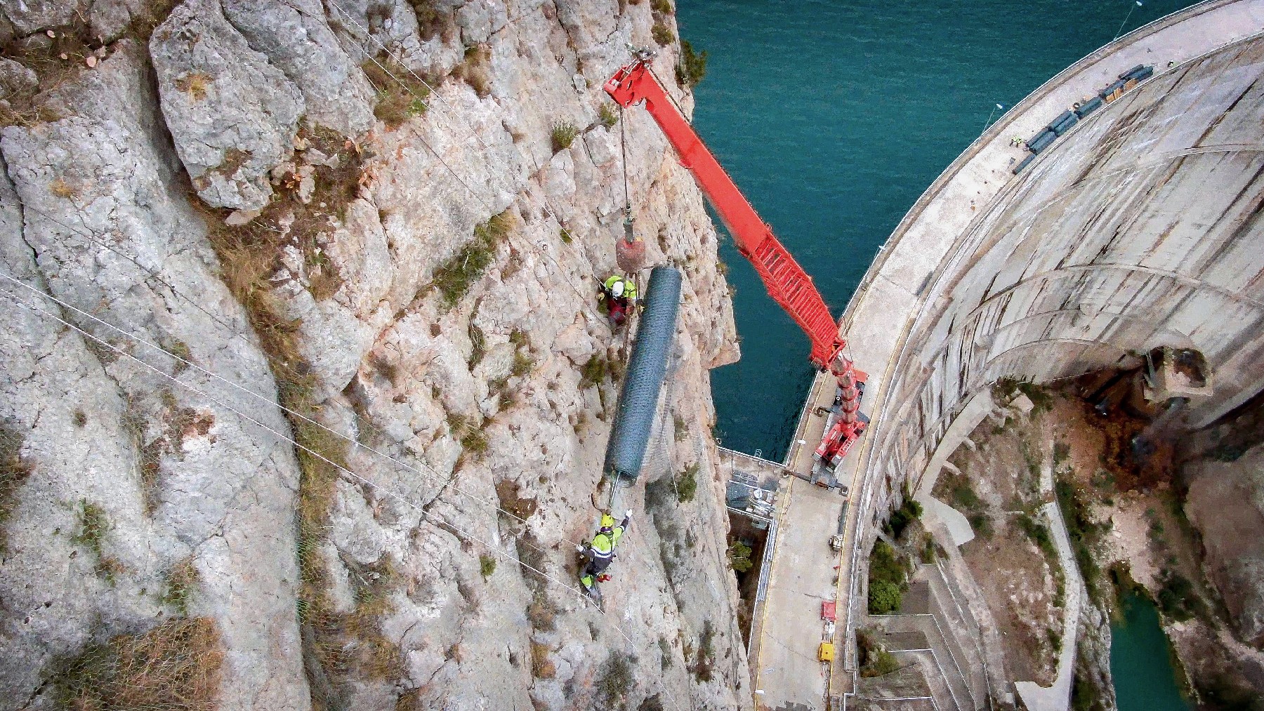 L'esllavissada de roques va provocar greus danys al desguàs de fons fins al punt de deixar-lo inoperatiu. Per aquest motiu va caldre, en primer lloc, abordar els danys causats per l'incident com estabilitzar el massís rocós per tal de minimitzar el risc de futures caigudes, amb garantia de seguretat de la presa i els seus accessos. Així, es va instal·lar un sistema de protecció i estabilització de la vessant consistent en una doble membrana per captar esllavissades de diferents mides. En total, s'han col·locat 7.000 metres quadrats de malla d'acer de triple torsió combinada amb una xarxa d'anelles. Per fer-ho van fer falta tècniques d'escalada, en una paret vertical de 160 metres d'alçada. A més, s'hi van instal·lar ancoratges profunds per cosir les diferents capes superficials i l'estabilitat dels estats rocosos.