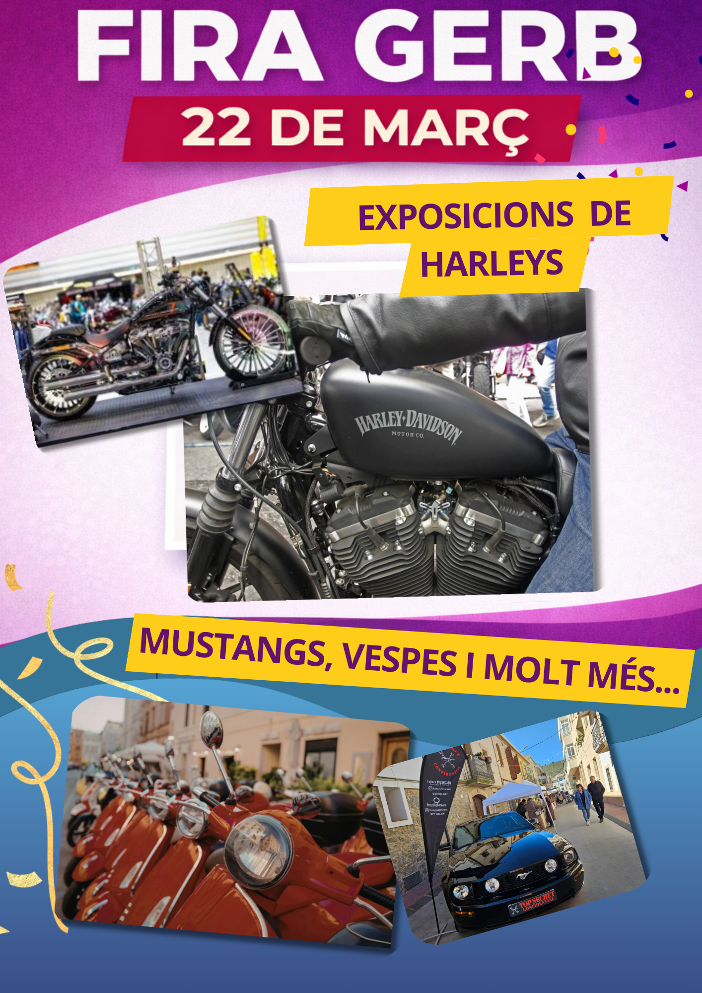 A més, els visitants podran gaudir d’exposicions de vehicles emblemàtics com Harley Davidson, Mustangs i Vespes, que aportaran un toc distintiu a la jornada.