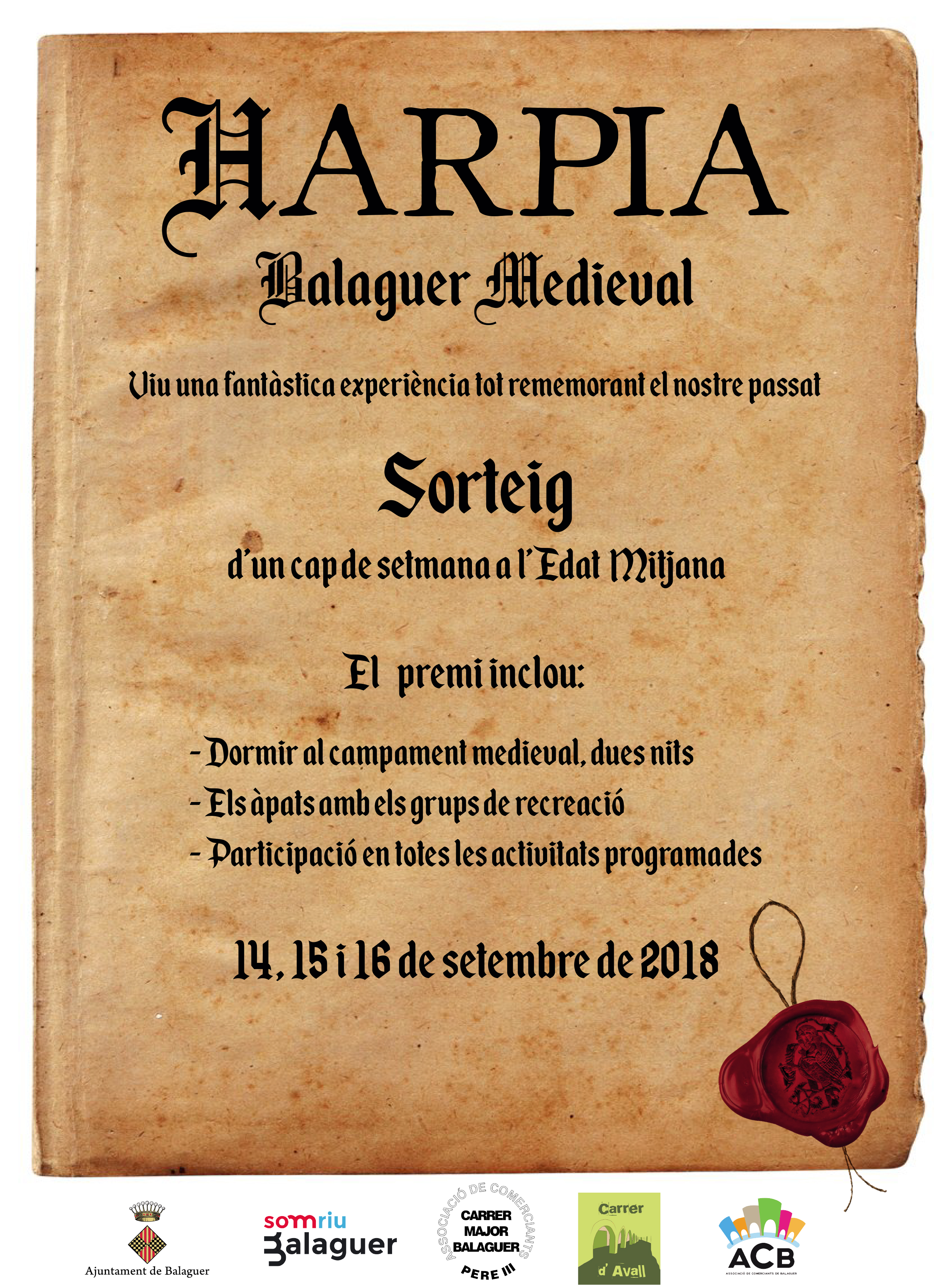 A partir d'aquest divendres i fins al 10 de setembre, l'Ajuntament i els comerciants de Balaguer organitzen un sorteig d'un cap de setmana a l'Edat Mitjana coincidint amb la celebració de la Festa Harpia 2018
