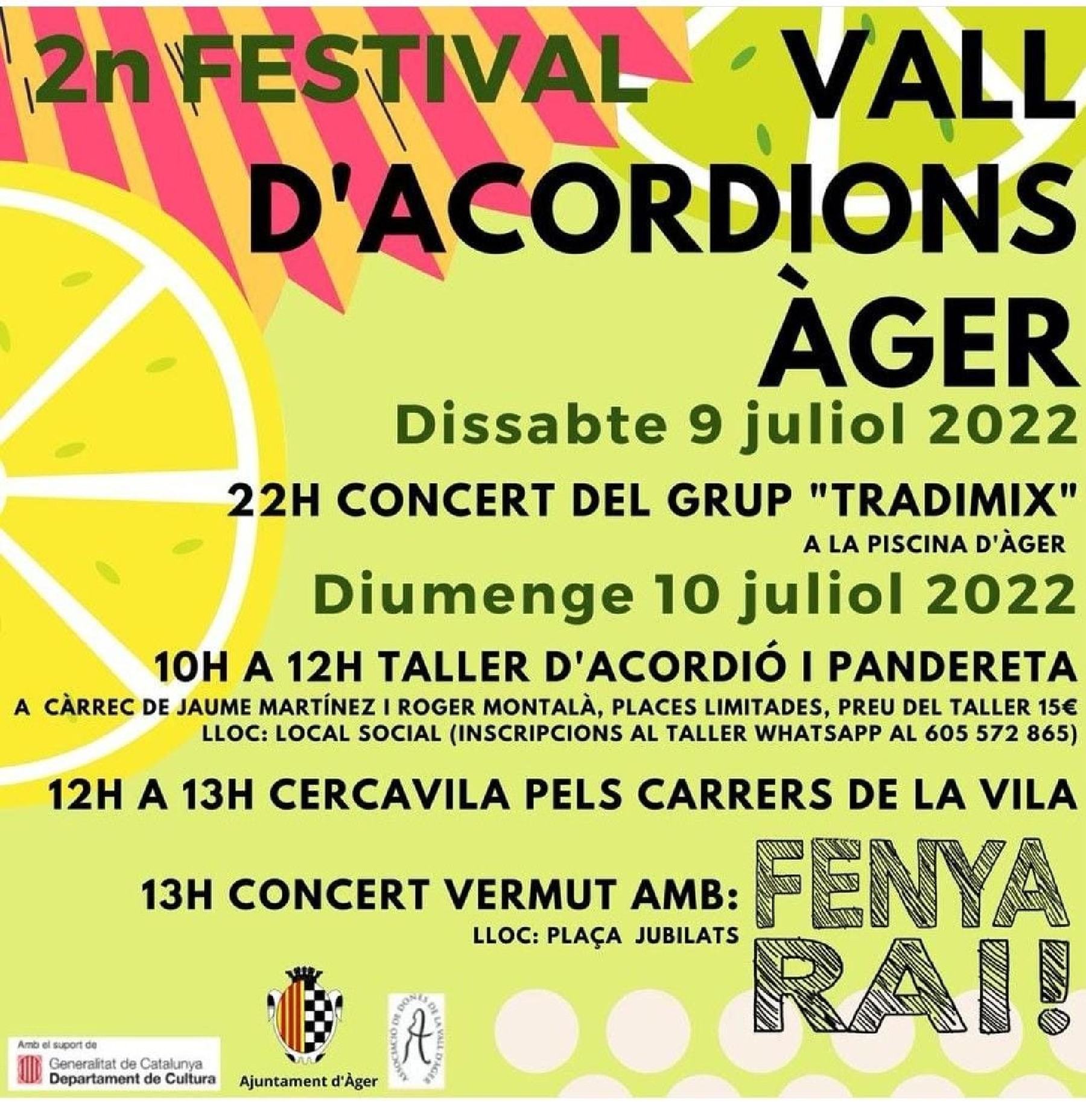 Àger ja ho té tot a punt per celebrar aquest cap de setmana la segona edició del Festival Vall d'Acordions, que comptarà amb concerts, tallers i una cercavila musical amb l'objectiu de reivindicar aquest instrument fonamental per la música popular arreu d'Europa a partir del segle XIX. Els actes, que començaran aquest dissabte, 9 de juliol, i s'allargaran fins diumenge, es duran a terme en diferents indrets del municipi i estan pensats per a tots els públics.