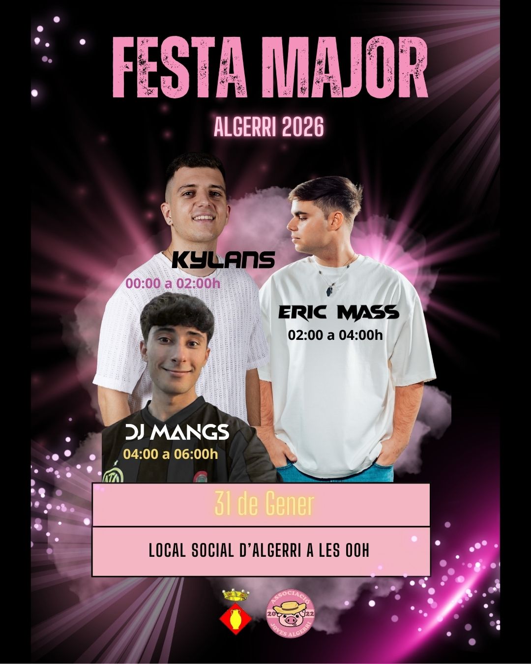La festa començarà dissabte a les 5 de la tarda, amb animació infantil i La festa dels colors, a càrrec de Marieta Voltereta. A les 9 del vespre tindrà lloc el sopar popular, organitzat per l’Associació de Joves d’Algerri, i tot seguit hi haurà actuació musical amb Sonsonite. La nit acabarà amb sessió de DJs a partir de la mitjanit, amb Kylans, Djeric Mass i DJ Mangs.