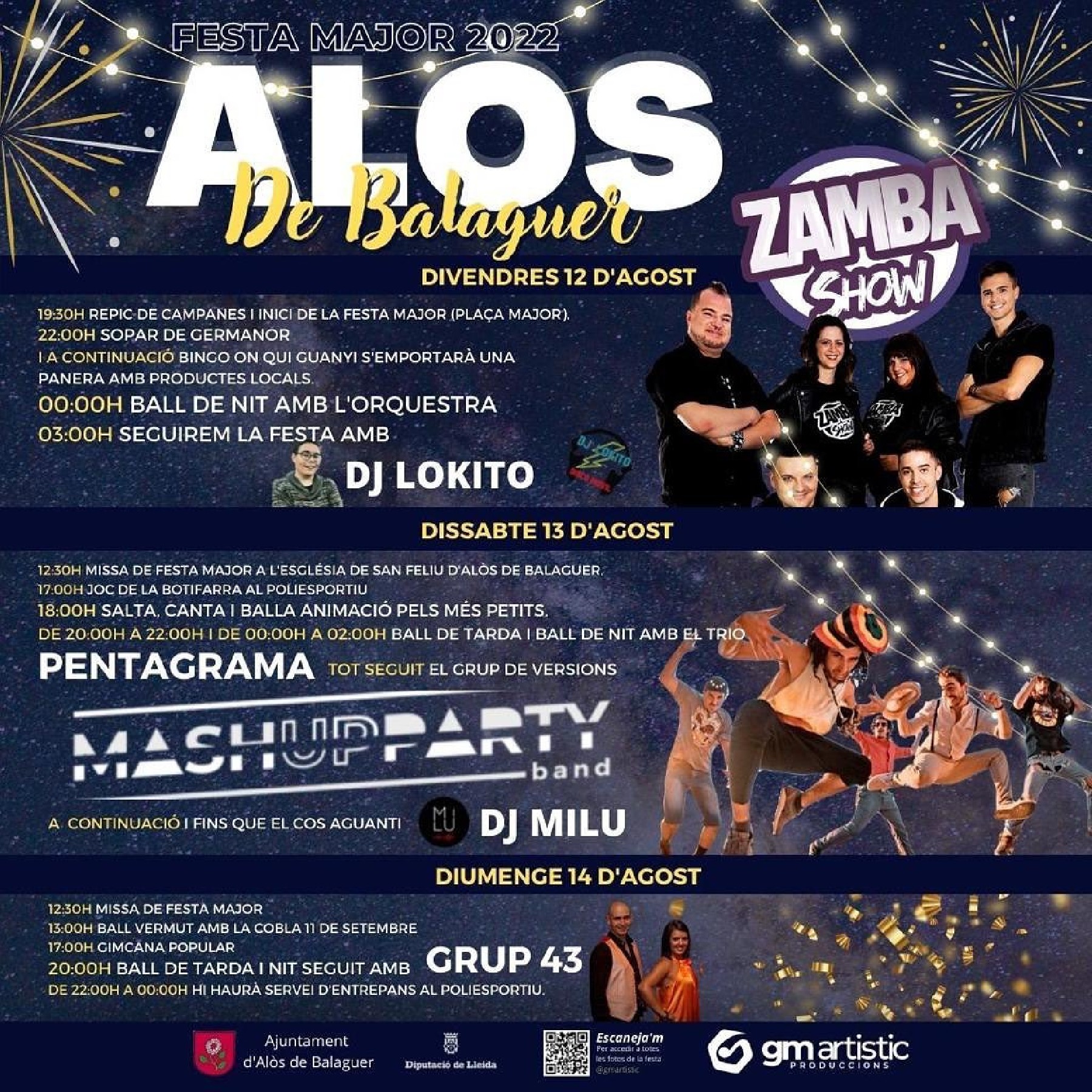 El programa d'actes de la festa major d'Alòs de Balaguer començarà divendres amb un sopar de germanor, que acabarà amb un bingo, una sessió de ball amb l'orquestra Zamba Show i la sessió del dj Lokito.