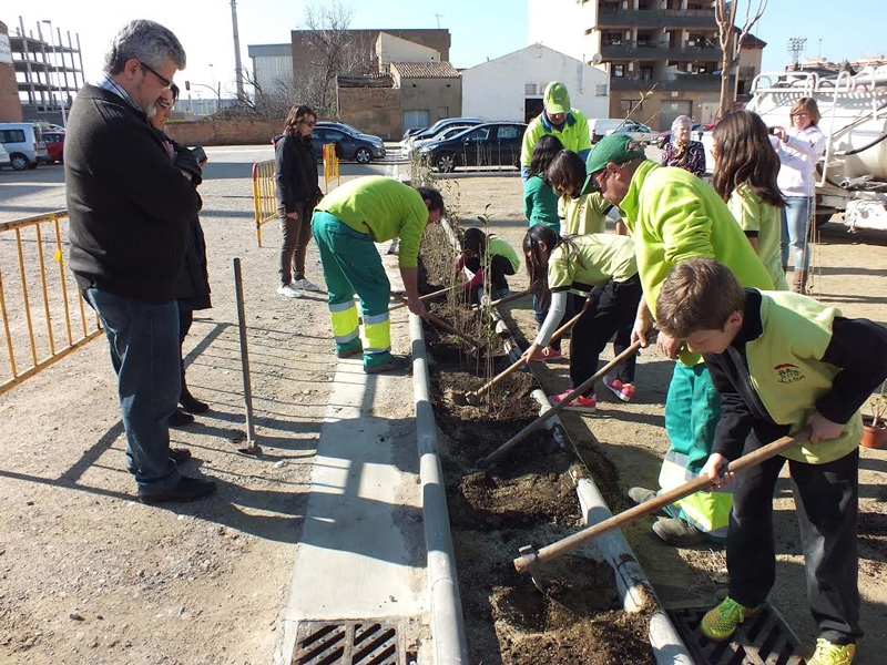 Alumnes de 4rt de primària de les escoles de Balaguer participen aquesta setmana en la plantada d'arbres que s'està fent a l'esplanada de davant la residència Comtes d'Urgell.