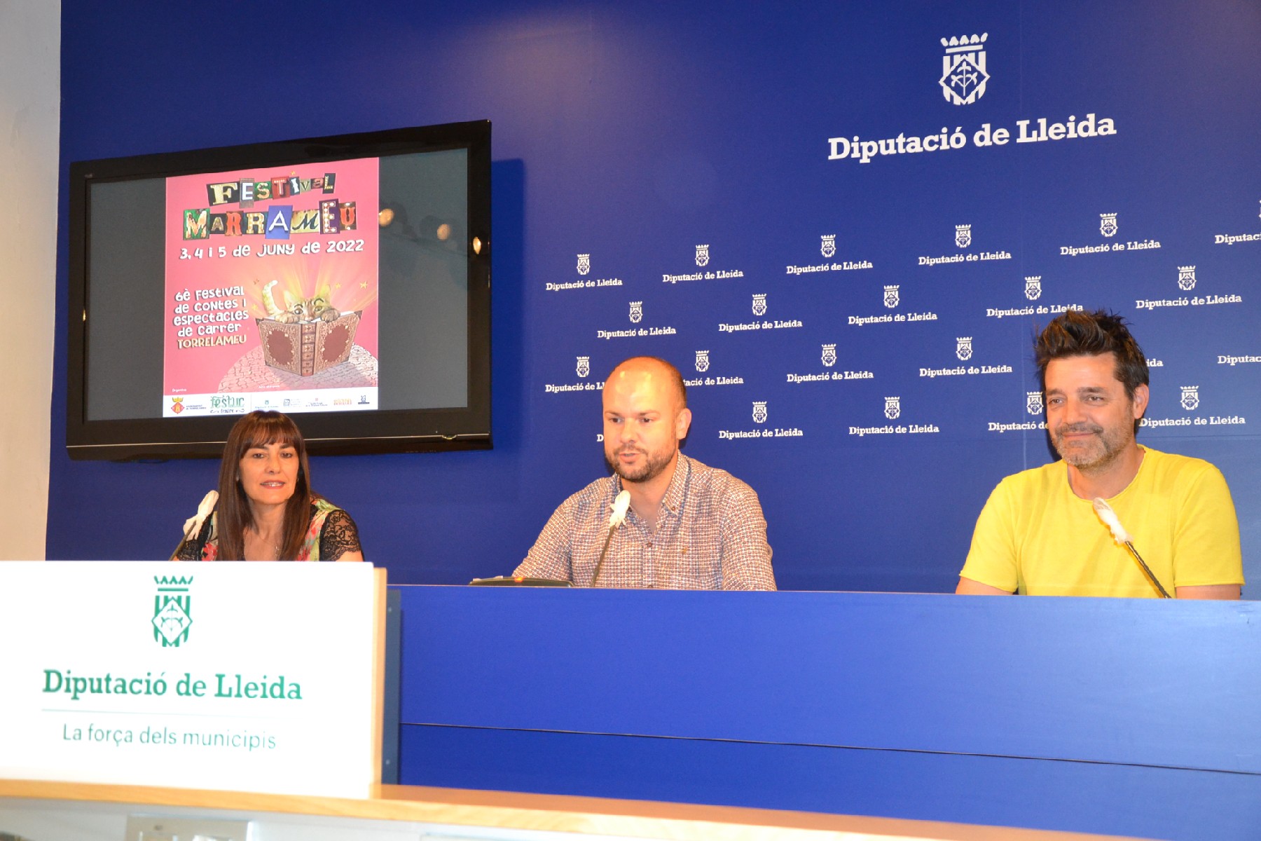 El diputat Jordi Verdú, acompanyat del director del Festival, Pere Pàmpols, i de la regidora d'Economia i Finances, Promoció Econòmica, Atenció a les Persones i Salut de l'Ajuntament de Torrelameu, Dolors Gasol, han presentat aquest divendres el 'Festival Marrameu. 6è Festival de Contes i Espectacles de Carrer', que se celebrarà a Torrelameu entre els dies 3 i 5 de juny, sota l'organització de l'Ajuntament de Torrelameu i Festuc Teatre.