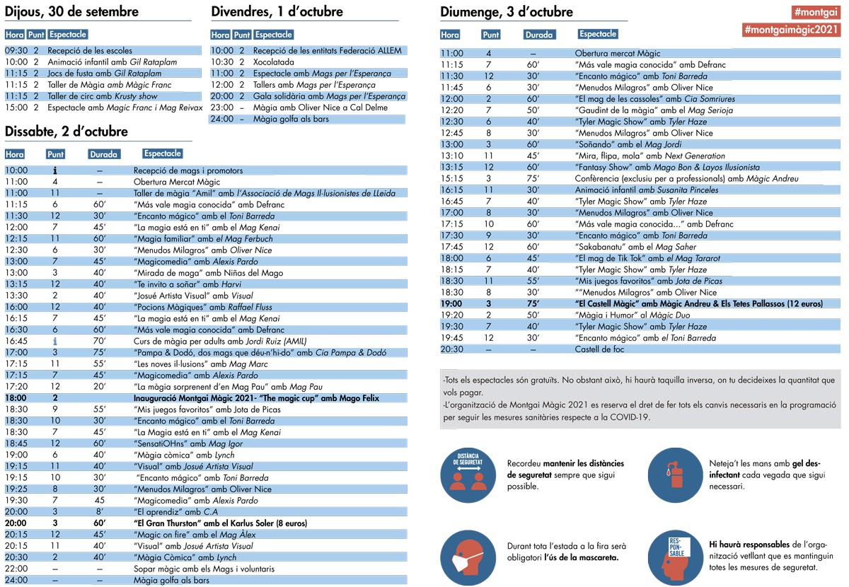 El calendari de funcions estarà força atapeït durant els quatre dies, de manera que es podrà gaudir dels espectacles des de les 10 del matí fins passada la mitjanit. A les més de 70 representacions que hi haurà s'uniran les ja habituals itinerants, que són aquelles de mags arribats a última hora o d'amants de la màgia que volen buscar un espai per donar a conèixer els seus espectacles.