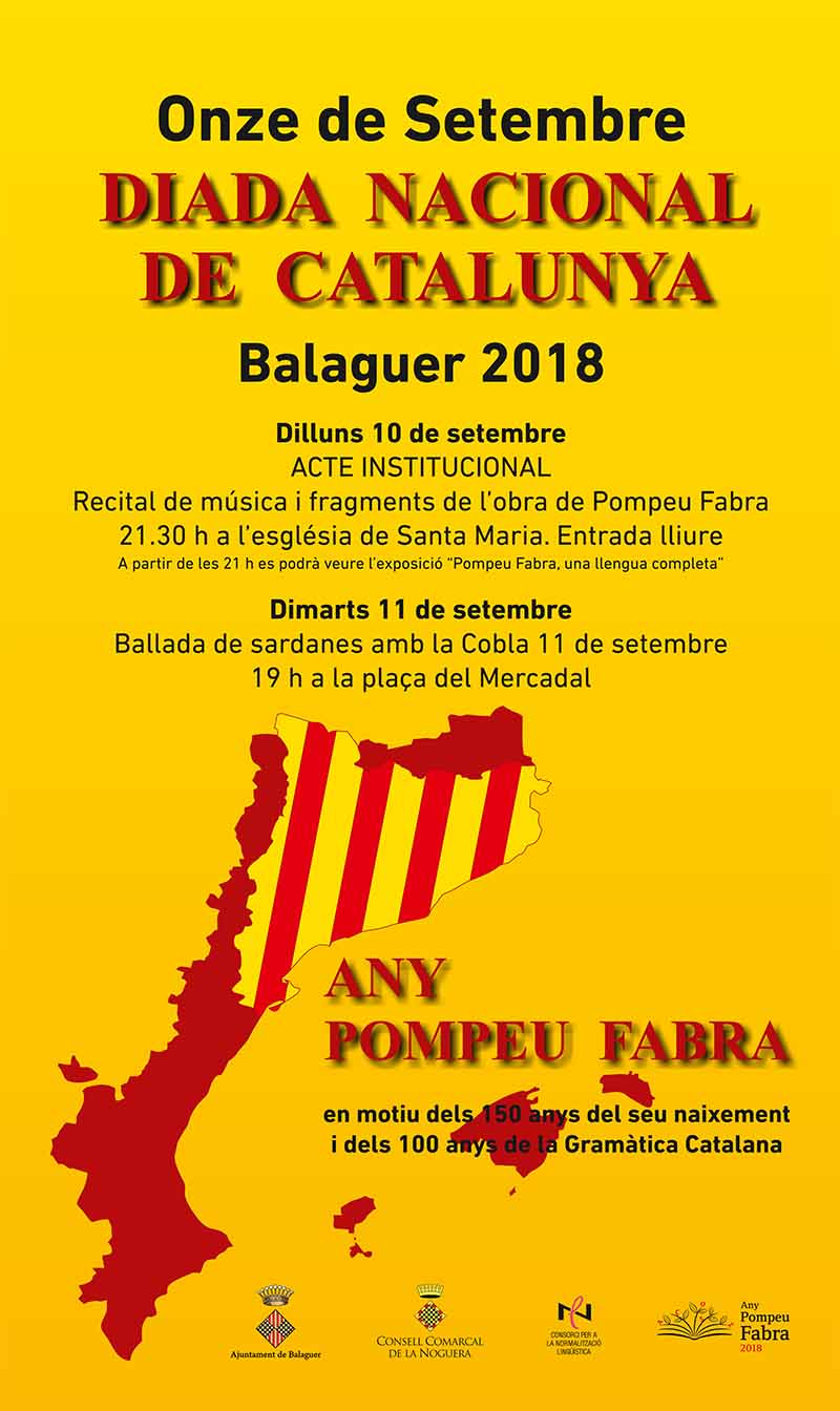 L'Ajuntament de Balaguer i el Consell Comarcal de la Noguera organitzen avui l'acte institucional en motiu de la Diada Nacional de Catalunya. L'acte girarà al voltant de la figura d'en Pompeu Fabra, en motiu de l'any Fabra, dedicat a commemorar la figura i l'obra del autor.
