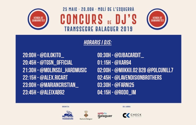 Aquest dissabte 25 de maig tindrà lloc el Concurs de DJs per la Transsegre 2019. 12 djs disposaran de 30 minuts cadascun per convèncer el públic present al pavelló Molí de l'Esquerrà, que és qui triarà per les xarxes socials