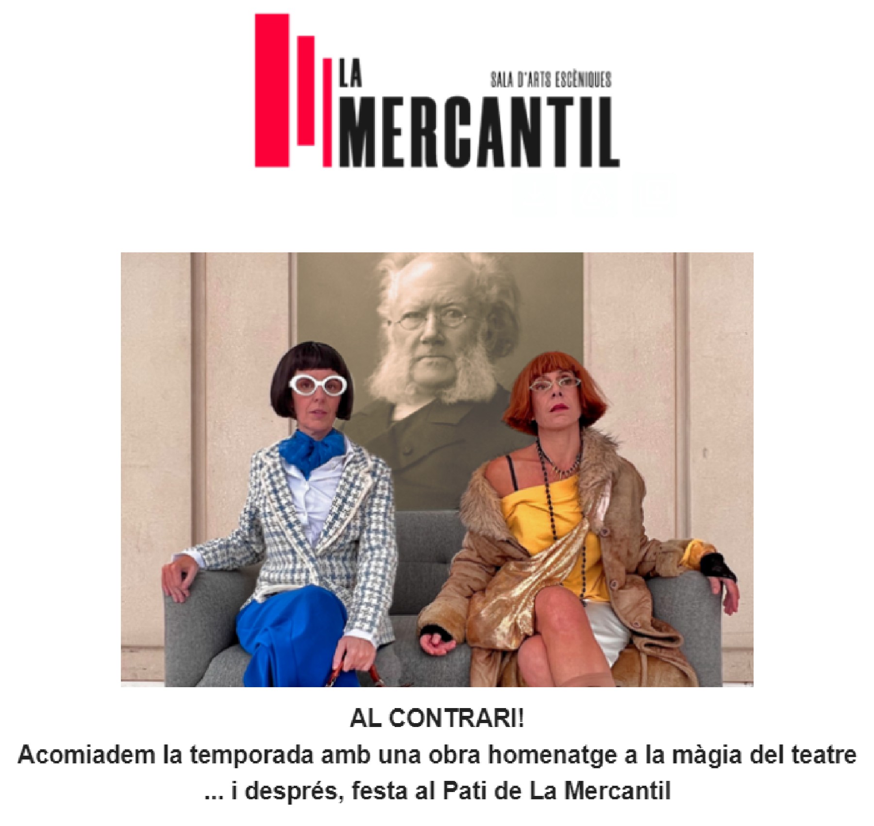 Aquest dissabte, 29 de juny es podrà veure a la Sala Mercantil l'obra de teatre 'Al contrari!'. Es tracta de l'última obra de la temporada i en acabar el públic assistent podrà gaudir d'un concert al pati amb Momo Cortés
