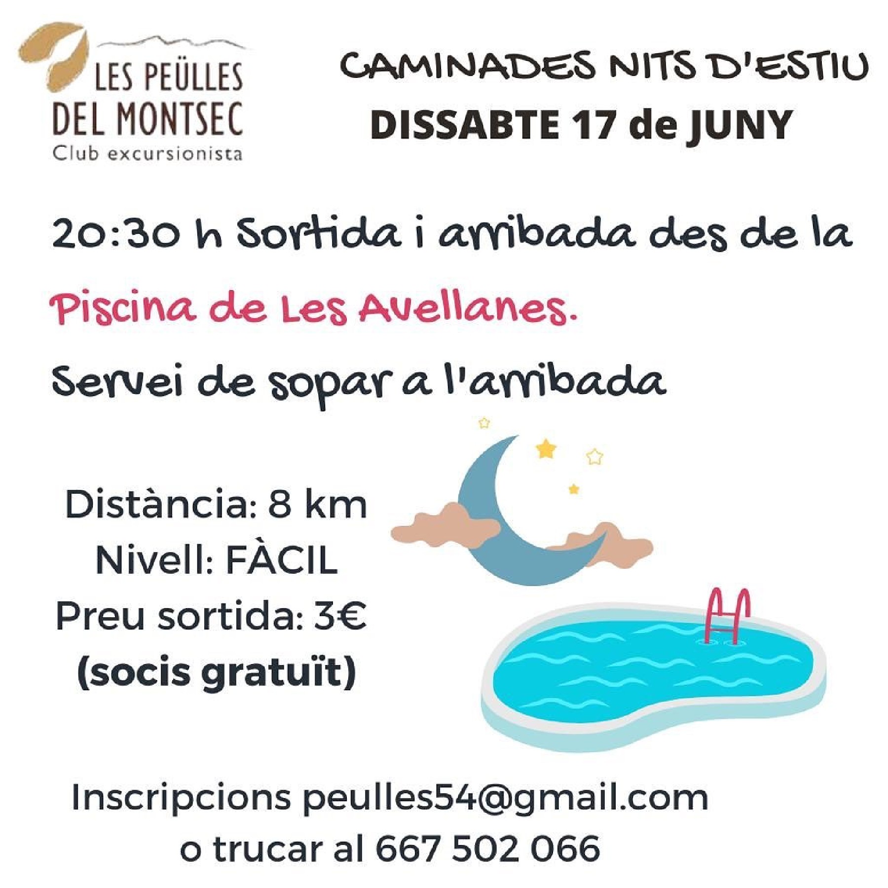 Per als socis de les Peülles serà gratuïta i per als no socis tindrà un preu de 3€. La sortida serà a 2/4 de 9 de la tarda des de la piscina de Les Avellanes, que també esdevindrà el punt d'arribada.