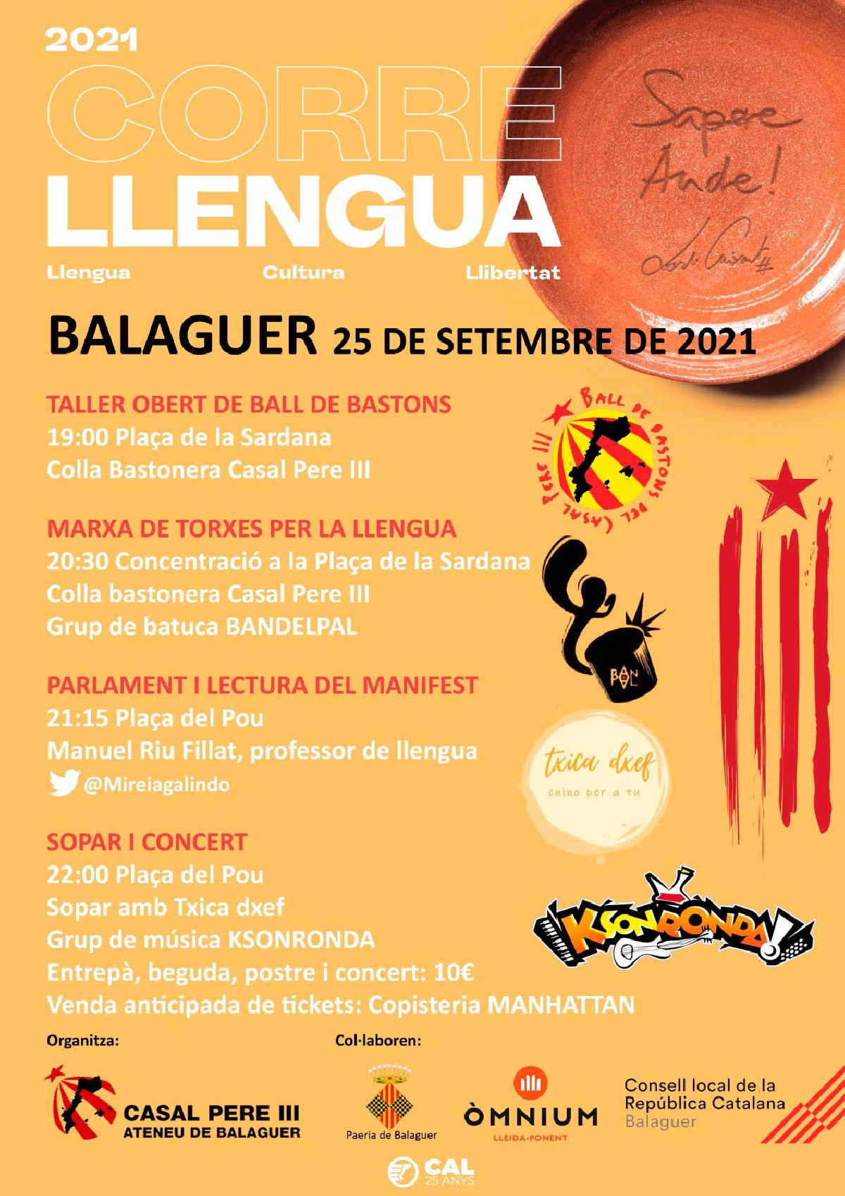 A les 21:15h hi haurà un parlament a càrrec de Manel Riu i Fillat, professor de llengua i tot seguit lectura de manifest. En acabar, a les 22h, sopar popular amenitzat pel grup de música folk Ksonronda.