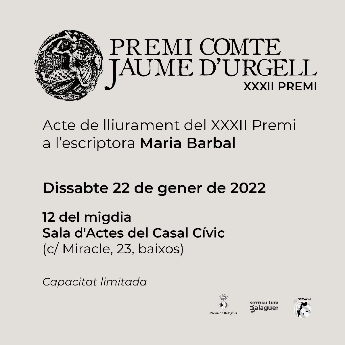 Aquest dissabte es farà l'entrega del XXXII Premi Comte Jaume d'Urgell a l'escriptora MARIA BARBAL. L'acte tindrà lloc a la sala d'Actes del Casal Cívic del Miracle a les 12 del migdia