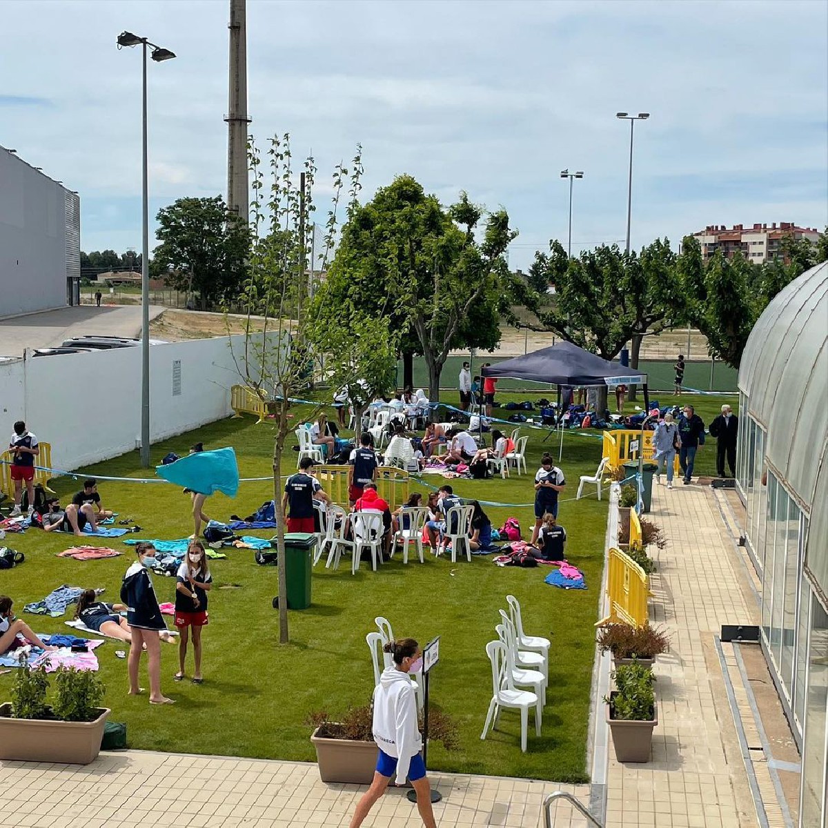 Les restriccions pel coronavirus suposen també l'absència de públic, i el fet que els nedadors que no estan competint s'esperin a la gespa exterior de la piscina.