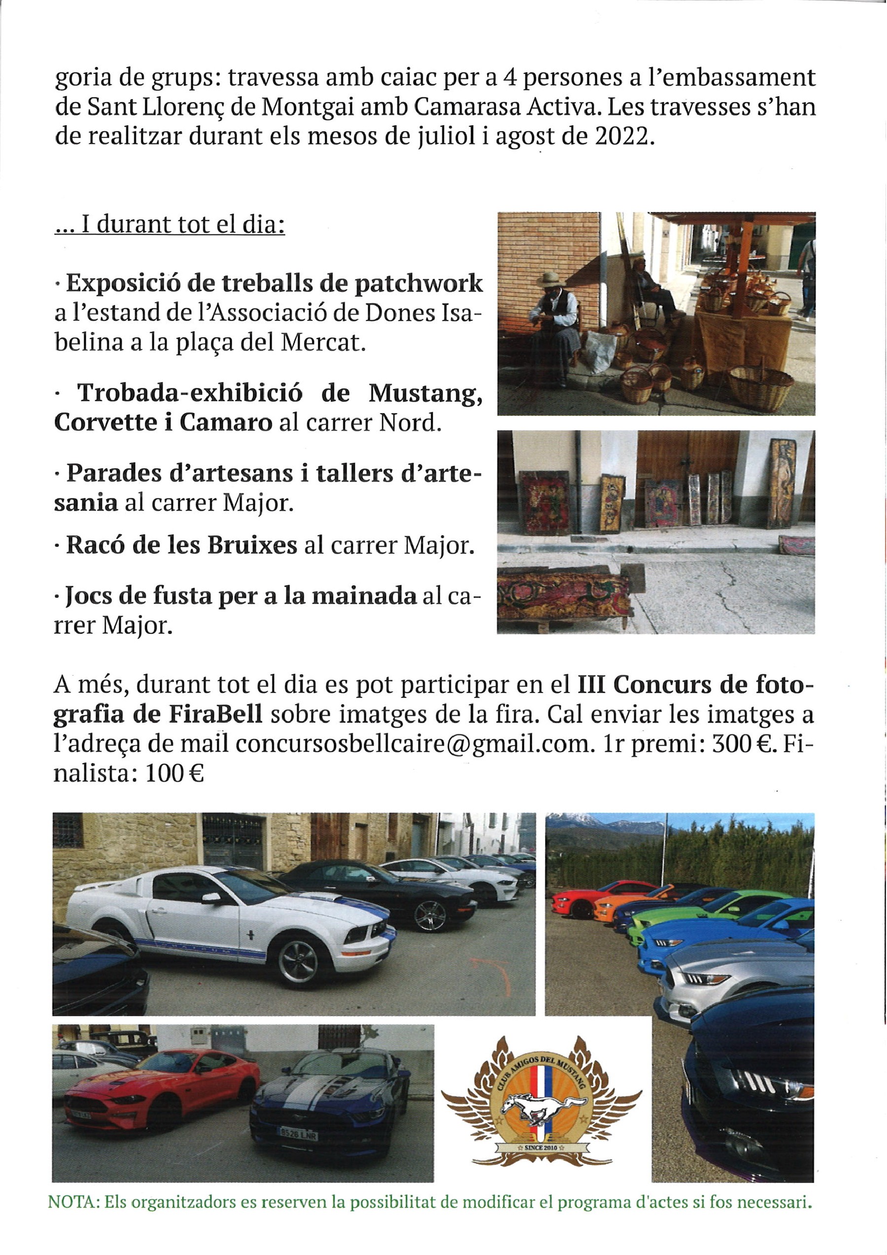 A més, durant tot el dia es podrà participar en el III Concurs de fotografia de FiraBell sobre imatges de la fira. Cal enviar les imatges l'adreça de mail concursosbellcaire@gmail.com. 1r premi: 300€. Finalista: 100€. Consulta les bases aquí