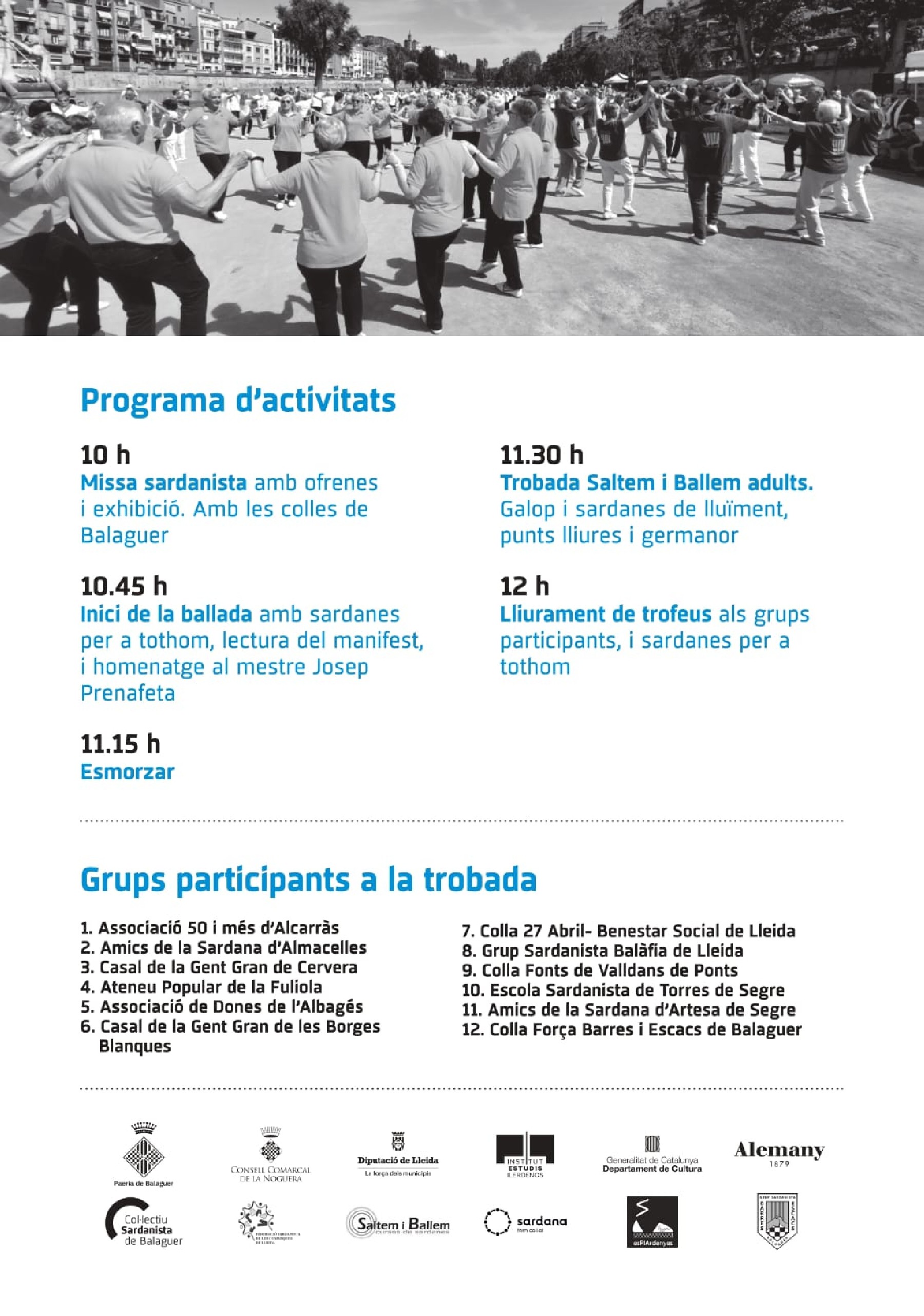 Per aquesta edició de la Trobada Sardanista d'Adults del programa del Saltem i Ballem s'han inscrit dotze colles sardanistes d'arreu de Ponent. Demostraran les seves habilitats en l'execució de la dansa catalana les colles de l'Associació dels 50 i més d'Alcarràs, Amics de la Sardana d'Almacelles, Casal de la Gent Gran de Cervera, Ateneu Popular de la Fuliola, Associació de Dones de l'Albagés, Casal de la Gent Gran de les Borges Blanques, Colla 27 d'abril, Grup Sardanista de Balàfia i Casal Santa Teresa de Lleida, Colla Fonts de Valldans de Ponts, Escola Sardanista de Torres de Segre, Aufés Sardanes d'Alfés, Amics de la Sardana d'Artesa de Segre i la colla Força Barres i Escacs de Balaguer.