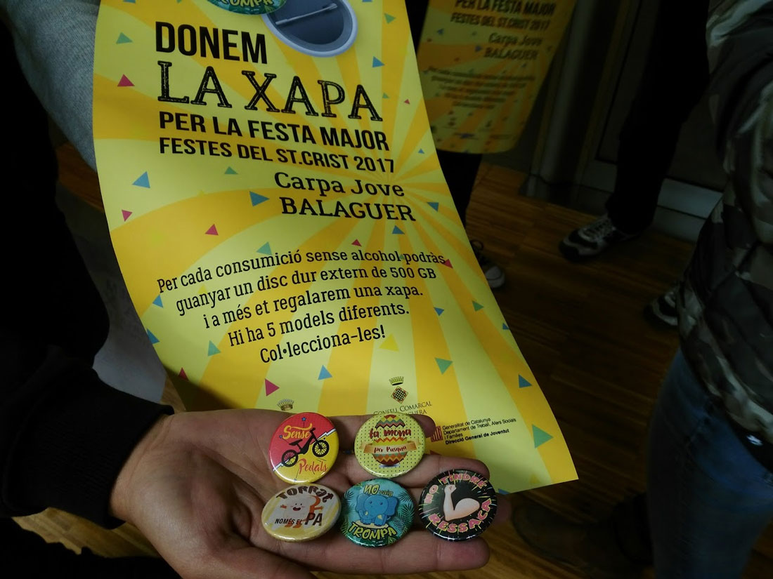 Sota aquest lema "Posa't la xapa", l'àrea de joventut de l'ajuntament de Balaguer i l'Oficina Jove de la Noguera, pretenen potenciar la consumició de begudes no alcohòliques durant els actes de la festa major de la ciutat de Balaguer entre els i les joves de la comarca. La finalitat és conscienciar sobre els efectes perjudicials de l'alcohol entre el jovent i afavorir el gaudi de les festes sense consumir begudes alcohòliques o si més no, fent-ne un ús responsable.