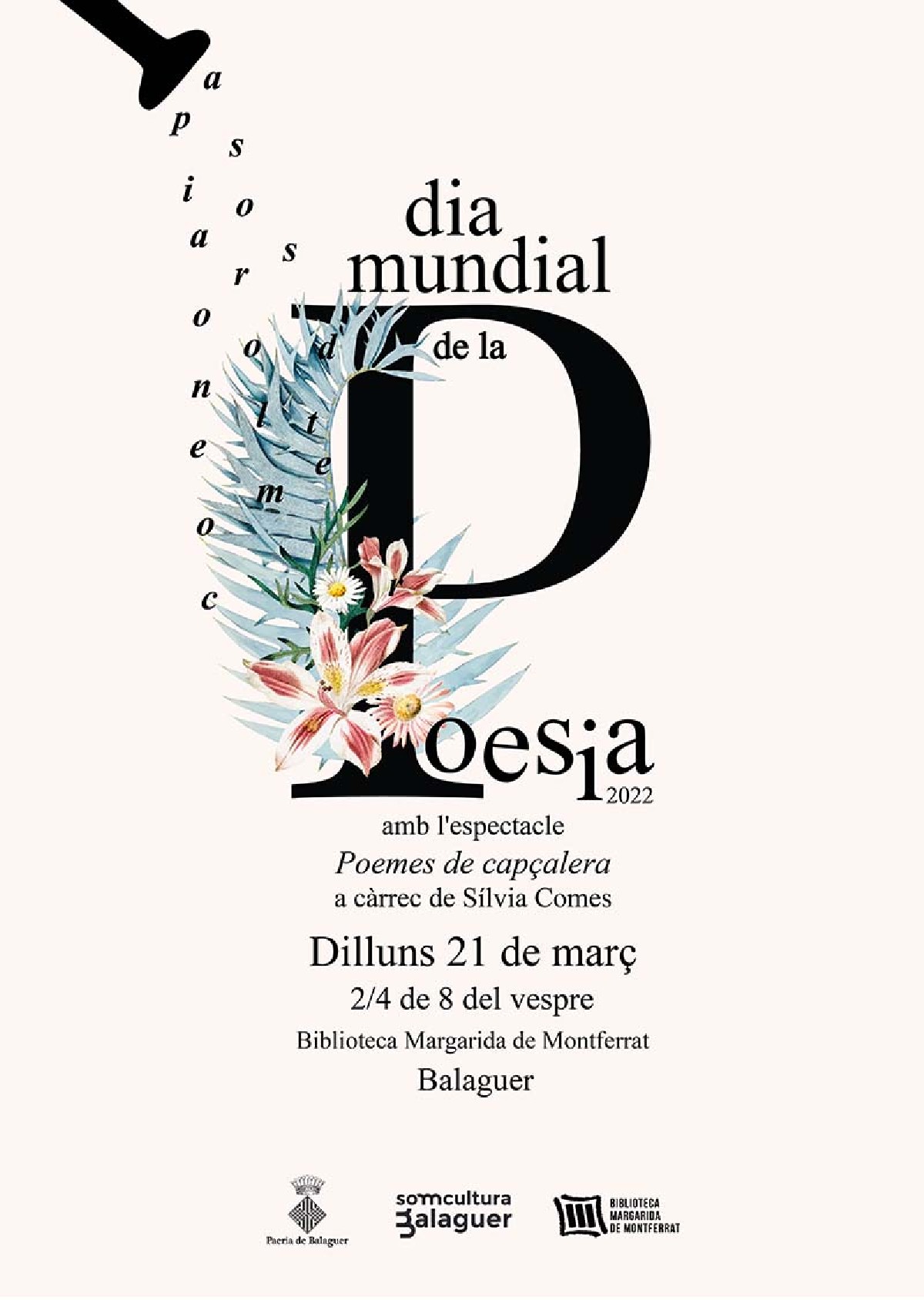 Aquest dilluns dia 21 de març tindrà lloc a la Biblioteca Margarida de Monferrat de Balaguer la celebració del Dia Mundial de la Poesia a Balaguer amb l'espectacle "Poemes de capçalera" amb Sílvia Comes, cançó i guitarra.