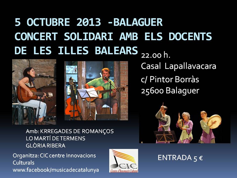 A les 10 de la nit, al Casal Lapallavacara, hi haurà un concert benèfic organitzat conjuntament pel Casal Pere III i el Centre d'Innovació Cultural i que servirà per recaptar fons pels docents de les Illes Balears que estan en vaga en defensa del català.