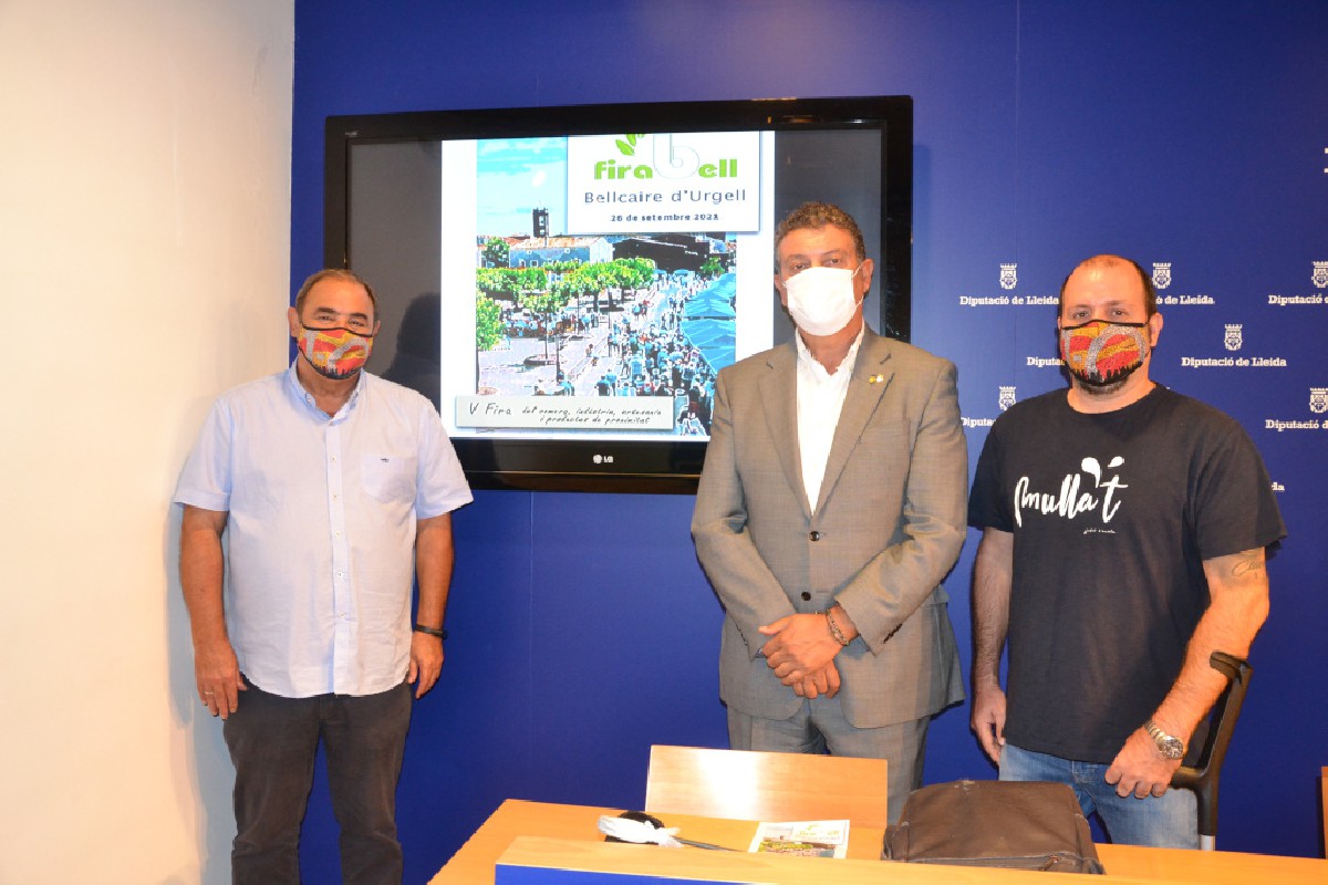 El vicepresident Ferran Accensi, acompanyat de l'alcalde de Bellcaire d'Urgell, Jaume Montfort, i del primer tinent d'alcalde, Jofre de Juan, han presentat aquest dimecres, a la sala de premsa de la Diputació de Lleida, la cinquena edició de Firabell, la fira del comerç, la indústria, l'artesania i els productes de proximitat que se celebrarà a Bellcaire d'Urgell el 26 de setembre.