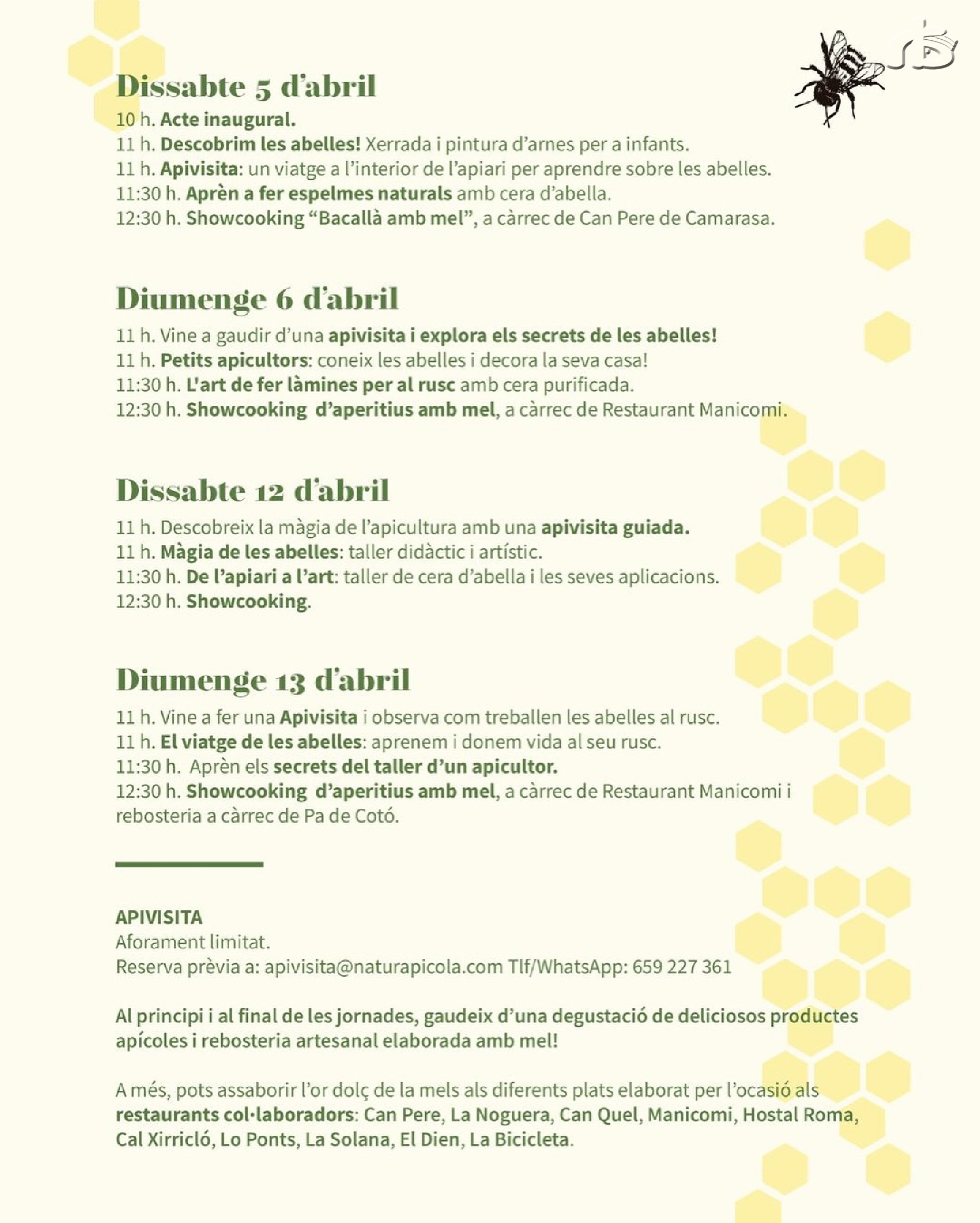 El programa d'activitats inclou visites als abellars, tallers familiars, exposició i venda de productes apícoles, demostracions d'extracció de mel, xerrades divulgatives i tastos de mel artesana. També s'hi afegeix els showcookings amb mel, on cuiners locals i apicultors mostren la versatilitat d'aquest ingredient a la cuina. Paral·lelament, diversos restaurants del territori ofereixen durant tot el mes d'abril plats amb mel a les seves cartes i menús.