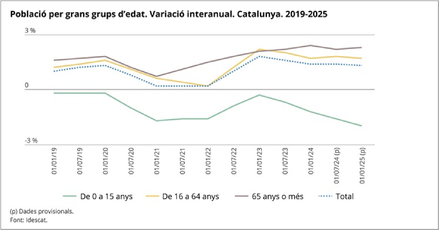Catalunya supera els 8,1 milions d'habitants, amb un creixement de l'1,3% durant el 2024. Creixen tots els grups d'edat excepte els menors de 16 anys, que ja són menys del 14,4%