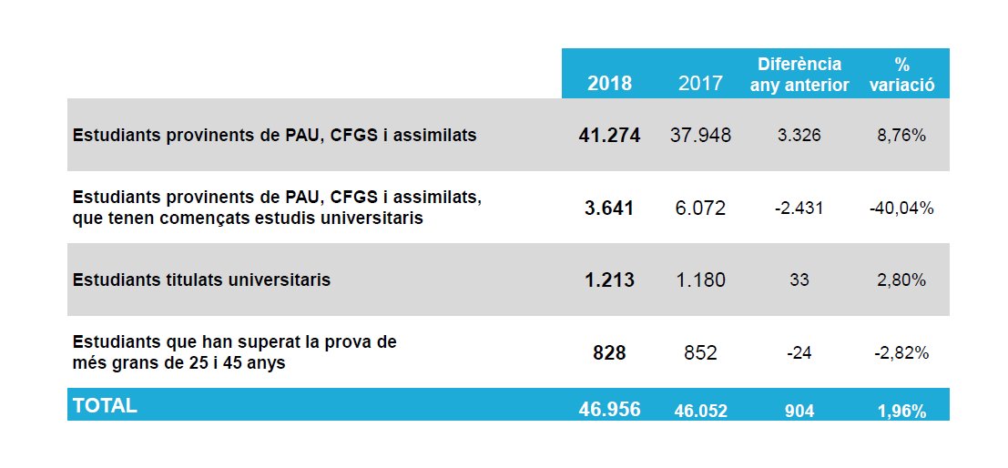 Prop de 47.000 estudiants s'han preinscrit per accedir a les universitats públiques i a la Universitat de Vic-Central de Catalunya el curs 2018-2019. El 88% dels futurs universitaris ja té assignada una plaça en algun dels estudis sol·licitats