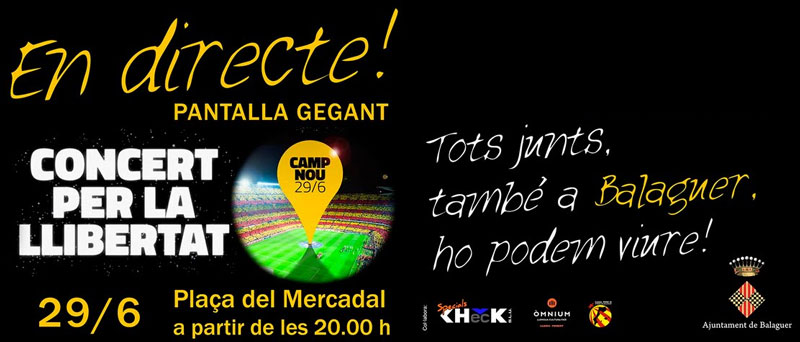 Balaguer instal·larà aquest dissabte una pantalla gegant a la plaça del Mercadal perquè tothom que ho desitgi pugui seguir en directe el Concert per la Llibertat que començarà a les 20h al Camp Nou.
