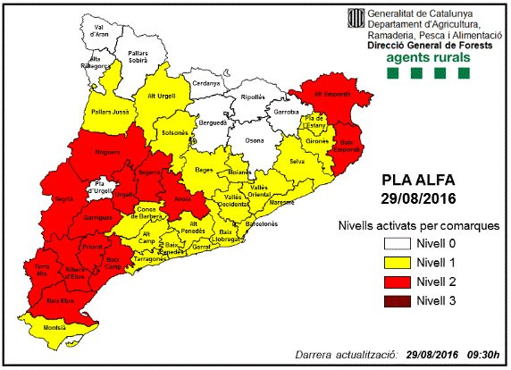 32 de les 42 comarques del país es troben aquest dilluns incloses en el pla Alfa dels Agents Rurals degut al risc d'incendi forestal.